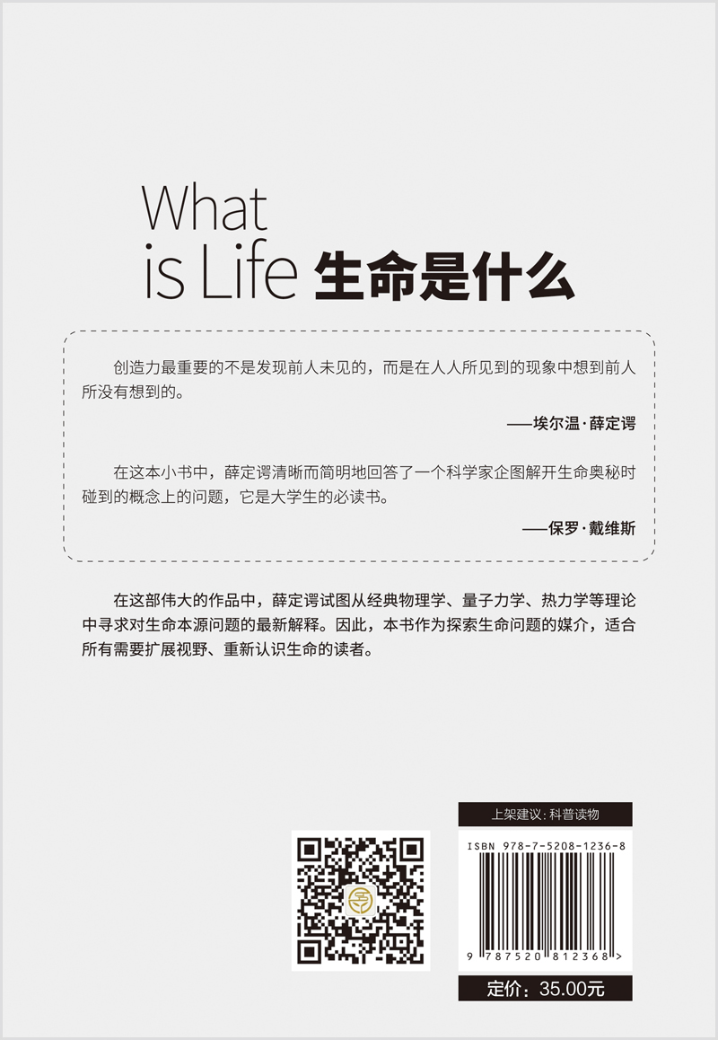 《生命是什么》是分子生物学的关键性著作,作者薛定谔的思想影响了一代生物学家,开创了信息生物学研究之先河,对20世纪后半叶生命科学和神经科学带来了深刻的影响和启发。薛定谔颠覆性地提出生命以“负熵”为食的观念,并特别强调用物理和化学的方法研究生命现象的重要性。开启了“生命即信息”的认知革命。内容轰动了当时的学术界和思想界,被当代著名物理学家西蒙尼认为“是我们世纪的物理学家中引人注目的哲学家”。
