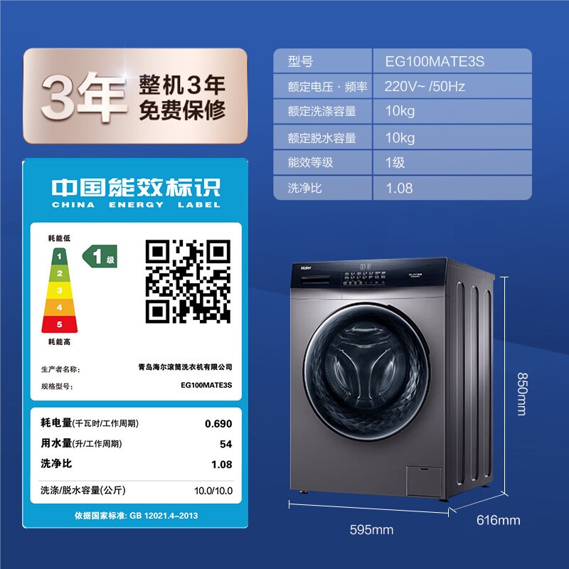 海尔 EG100MATE3S 滚筒洗衣机,搭载BLDC电机,动力强劲,创新环瀑水流,增加水流冲刷力度,模拟手洗和摔打,洗净率高达1.08。激光无缝焊接内筒不伤衣物,不易藏污纳垢。巴氏除菌程序,60℃持续杀菌,除菌率高达99.99%,除螨率为99.9%。搭载蒸汽除菌螨程序,无水护理更方便快捷,除菌去味更高效。