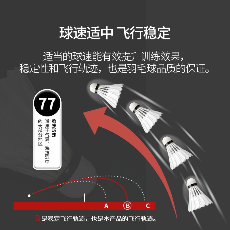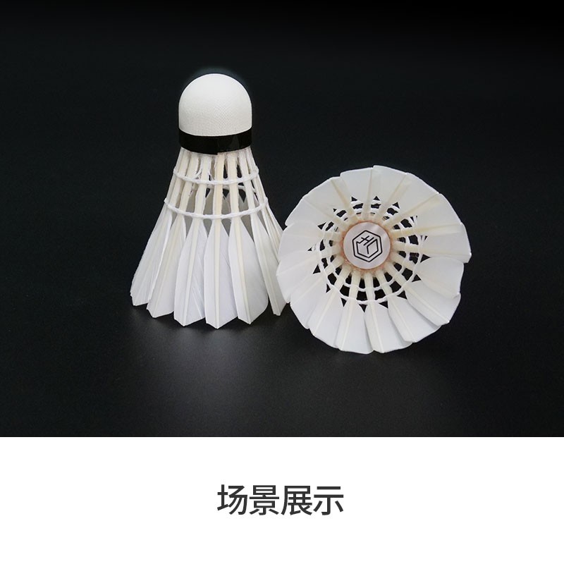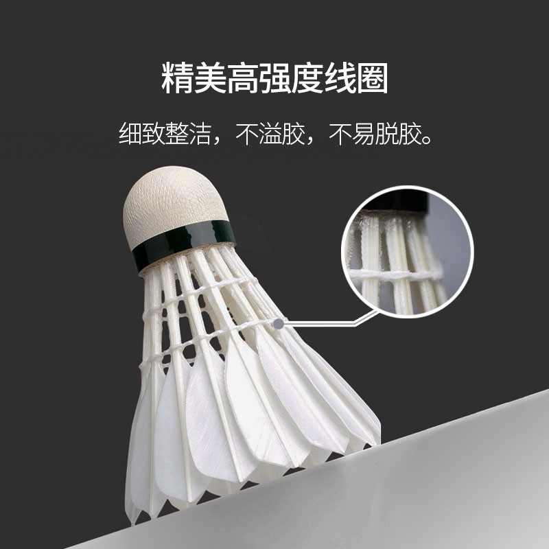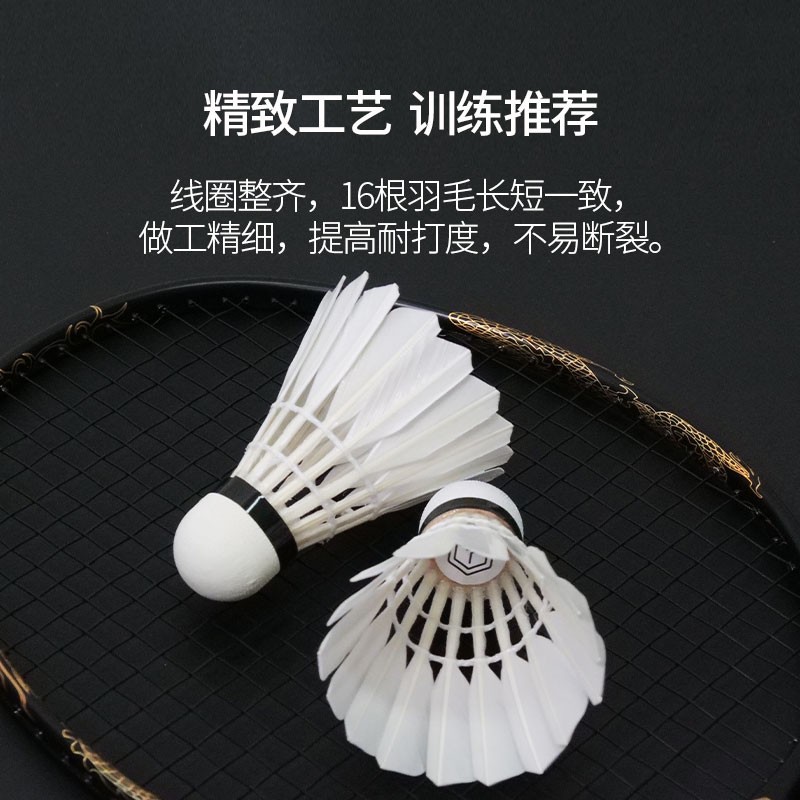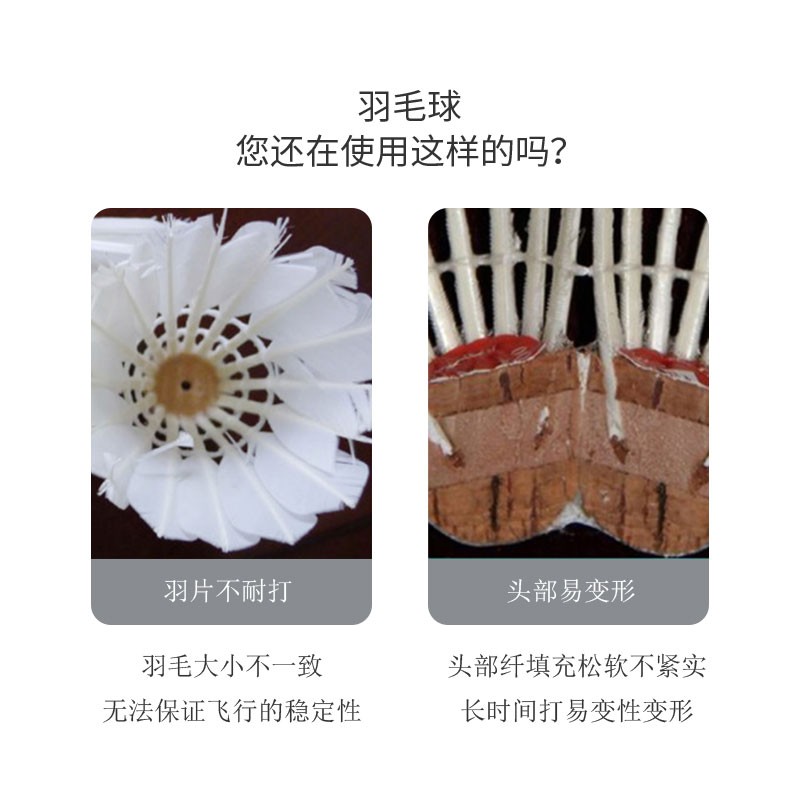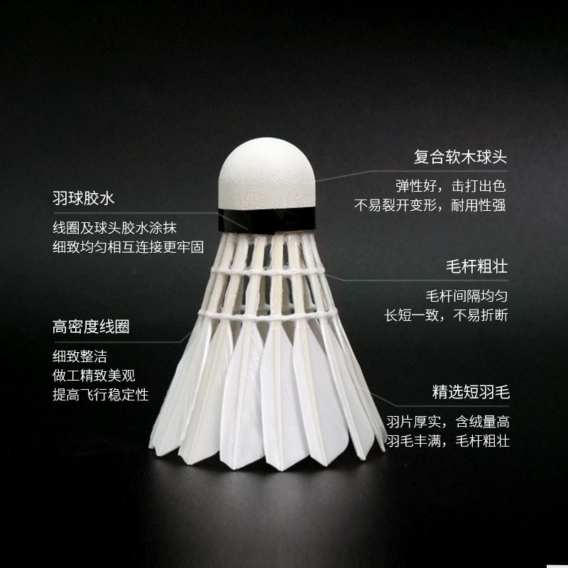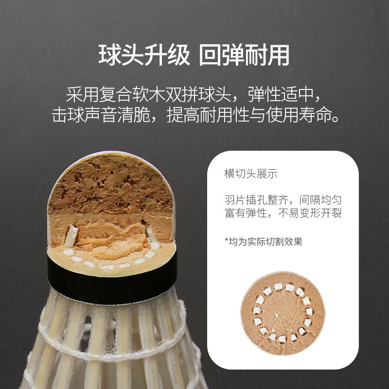 采用复合软木双拼球头,弹性适中,击球声音清脆,提高耐用性与使用寿命。每只遴选16枚优质的天然鸭毛,选取最适合的中段长度羽片,在高强度对打中保持合适的旋转飞行。适当的球速能有效提升训练效果,稳定性和飞行轨迹,也是羽毛球品质的保证。