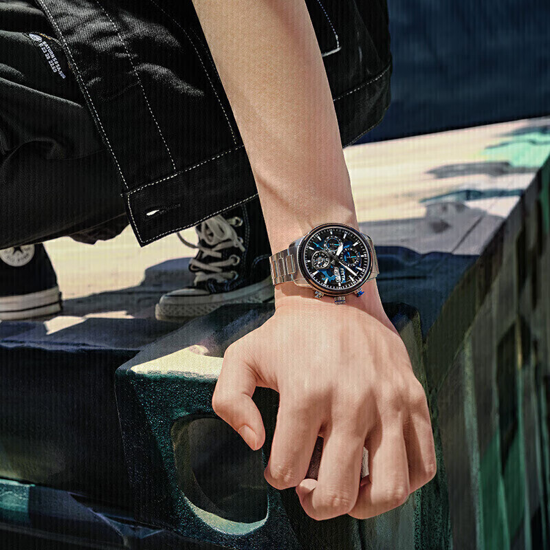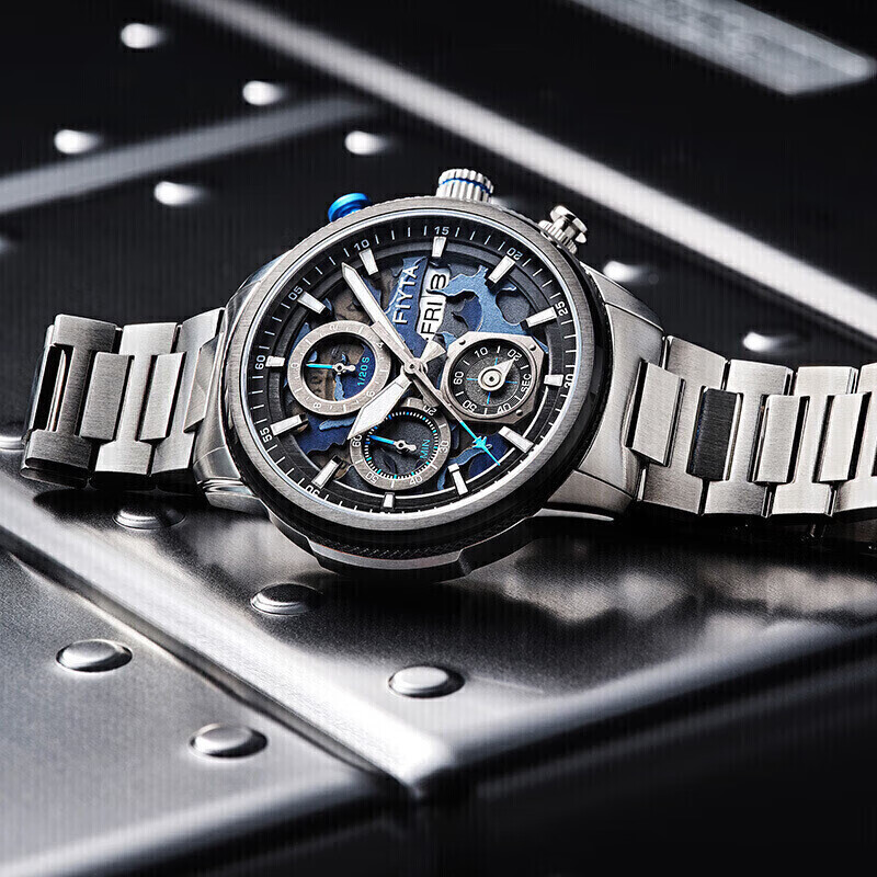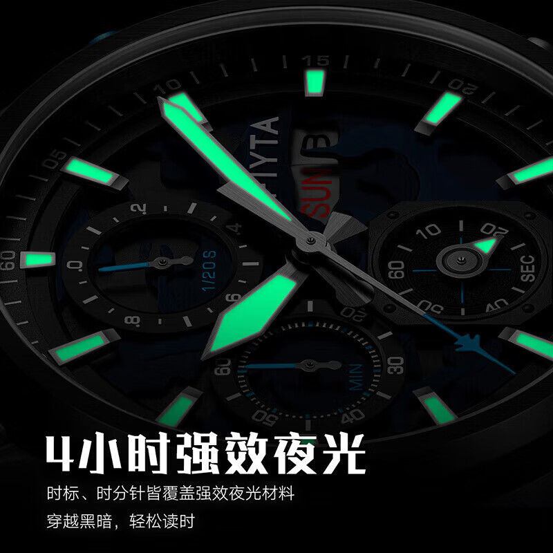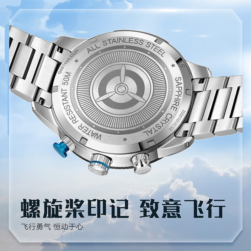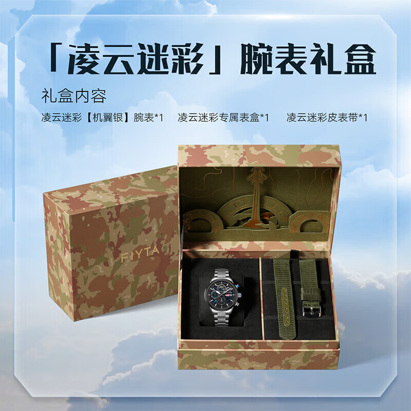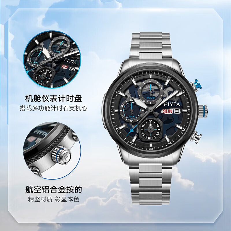 腕表从迷彩涂装汲取计时码表灵感,纵横炫酷,层层透视穿梭街头,酷GUY临场。铝合金是航空不可替代的关键材质,2点位按的由航空铝合金铸就,电化学保护层不易氧化或腐蚀,彰显飞行专业本色。表盘从飞行涂装汲取灵感,丛林迷彩”纹饰“三层”覆盖,镂空透视,硬核来袭。搭载计时石英机芯,具备双历功能,经飞亚达大师工作坊调校,走时精准秒盘、60分钟计时、1/20秒三大功能轻触按的,瞬间计时。