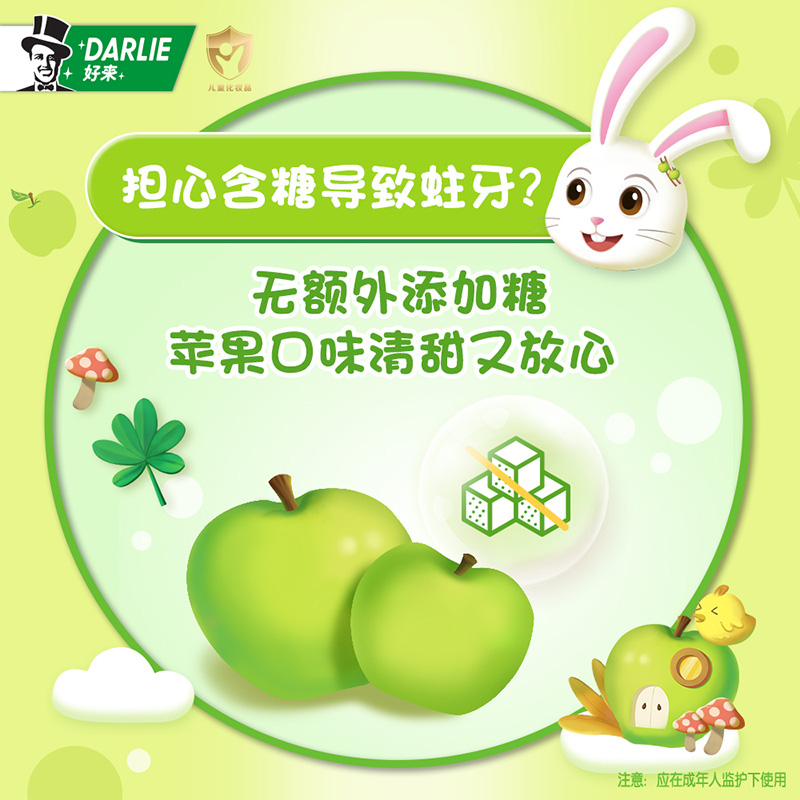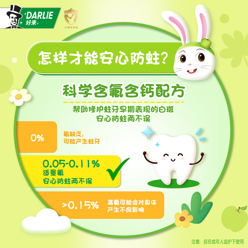 黑人(DARLIE)这款儿童牙膏,采用食品级原料制成,不添加糖,不会导致蛀牙,温和不刺激。香调清新自然,易于接受。使用过程低泡沫,深入全面清洁牙齿。包装外观附有可爱兔子卡通图案,萌趣可爱,增添刷牙乐趣。