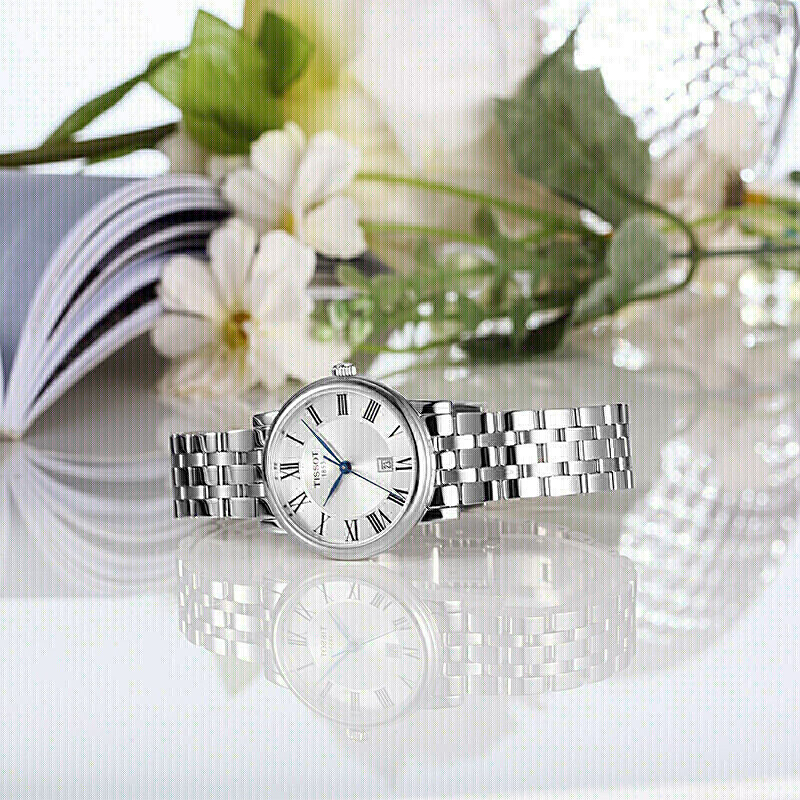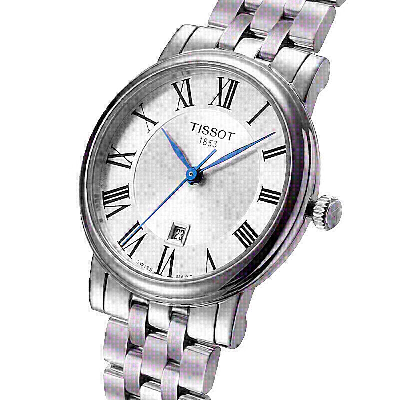 天梭推出的这款卡森臻我系列女士手表,选用银色表盘,罗马数字刻度搭配蓝色指针,加以独立日期窗口显示,方便你查看时间。不锈钢表带搭配三折扣,职场气息十足,佩戴舒适且方便脱戴。人工合成蓝宝石玻璃设计,防刮耐磨。具有生活防水功能,满足您的日常佩戴需求。