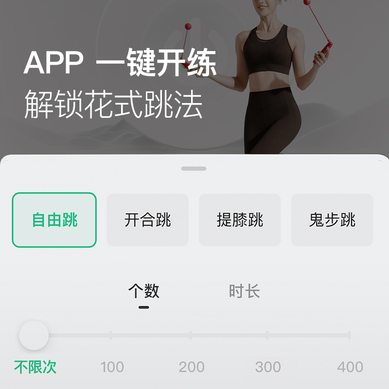 这是一款真正意义上的智能跳绳,可以跟课程、游戏进行联动,跳绳频率与音乐节奏合拍即可得分,挑战高分摆脱枯燥,轻松燃烧脂肪。室内室外模式可以切换,室内时可以换上无绳子球款,没有噪音不扰民。在室外的时候可以换上PVC绳款,采用三个高精度的霍尔传感器,精准传感检测,搭配智能互动芯片,顺滑度高,跳绳体验高更好。配置的锂电池具有超长续航能力,充满一次电可连续工作60天,待机长达180天。可以记录10位家庭成员数据,并进行绑定。