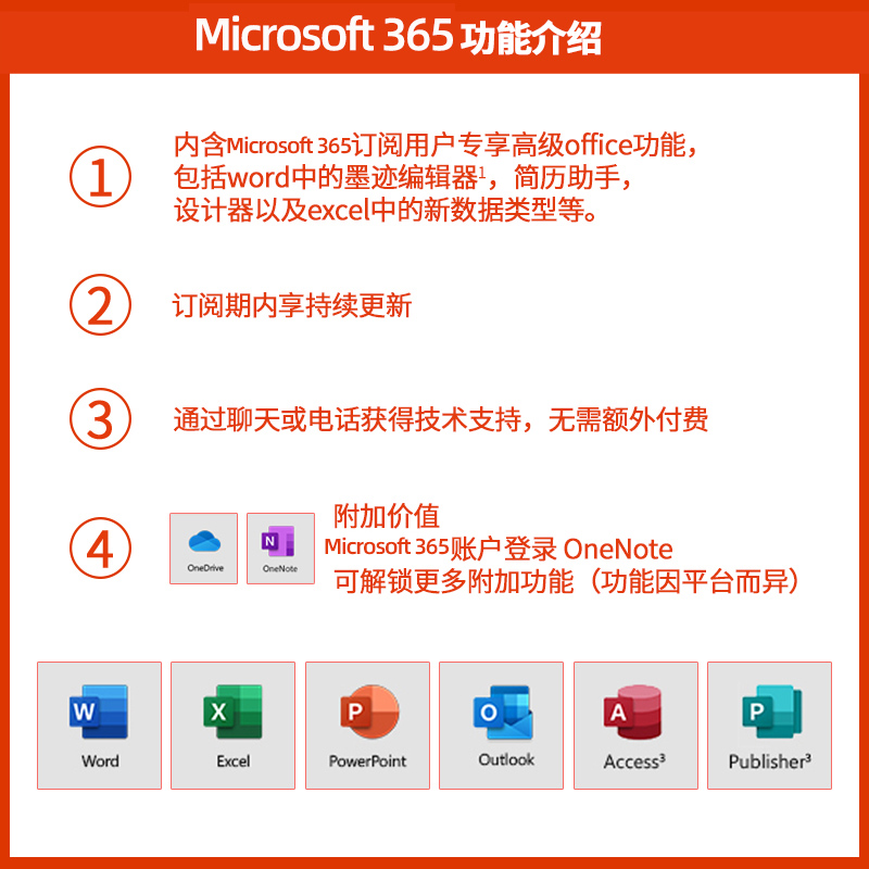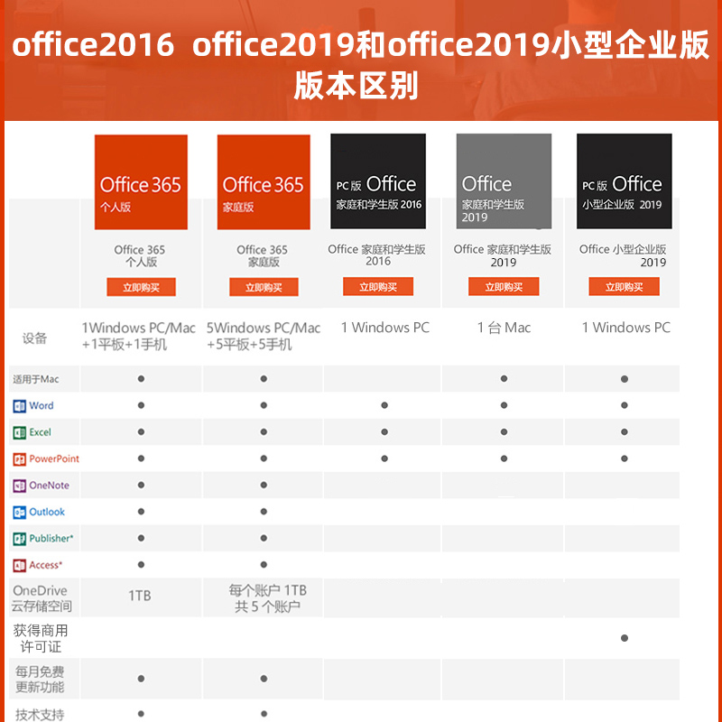 Office 365是微软推出的订阅式软件服务,订阅用户可以收到最新的Office更新,更新推送的速度比Office 2016这类一次性购买的版本要更快,且可以跨版本(如2016年年底购买,17年年中Office 2017发布,Office 365订阅用户可升级至最新的版本)。Office 365的另一特性是云端同步,基于OneDrive云存储,可以在多地、多台设备上访问文档、联机编辑,无需本地备份、U盘拷贝。包含Word、Excel、PowerPoint、OneNote、Outlook、Publisher、Access、OneDrive完整套装,非常适合移动办公、多台办公设备的用户。