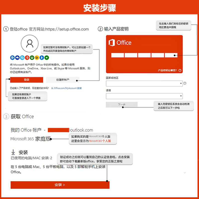 Office 365家庭版可以最多给六位家庭用户使用,可用于六台PC + 六台平板 + 六部手机(支持Windows/Android/Mac OS/iOS平台)。每人可以使用自己的微软账号和设备,每位用户都能获得1TB的OneDrive空间。