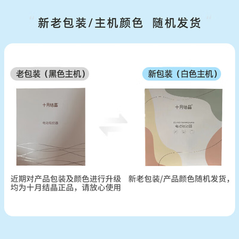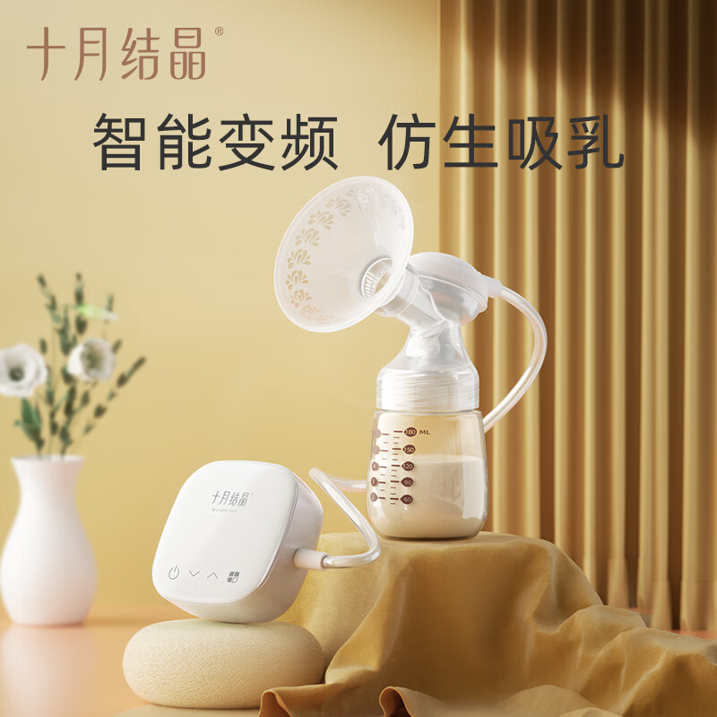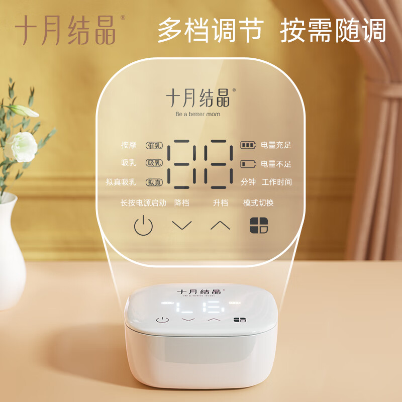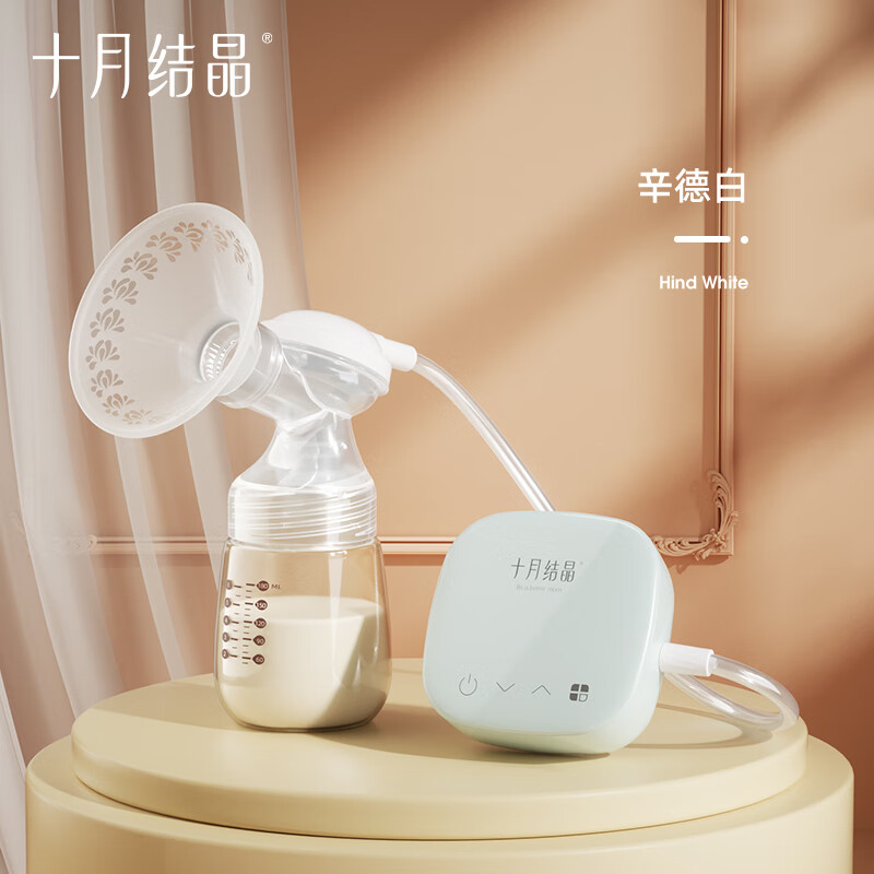 十月结晶品牌诞生于2006年,取自“幸孕结晶十月相伴”的理念,隶属施俞儿母婴用品有限公司,涉及妈妈产前产后护理用品领域。这款单边电动吸奶器,设有9档按摩模式、9档吸乳模式、9档混合模式,多种组合方式,满足不同的需求。采用二合一专利变频科技,在混合模式下,按摩和吸乳两种频率交替循环运行,有助于舒适泌乳、吸乳。双重防逆流设计,既防止奶瓶倾倒奶水倒流,造成二次污染,又防止奶水回流至主机,造成主机损坏。LED智能触控,简约易操作。其中配备了奶嘴、防尘盖、奶嘴牙盖等配件,可用于吸乳、存入和喂养。