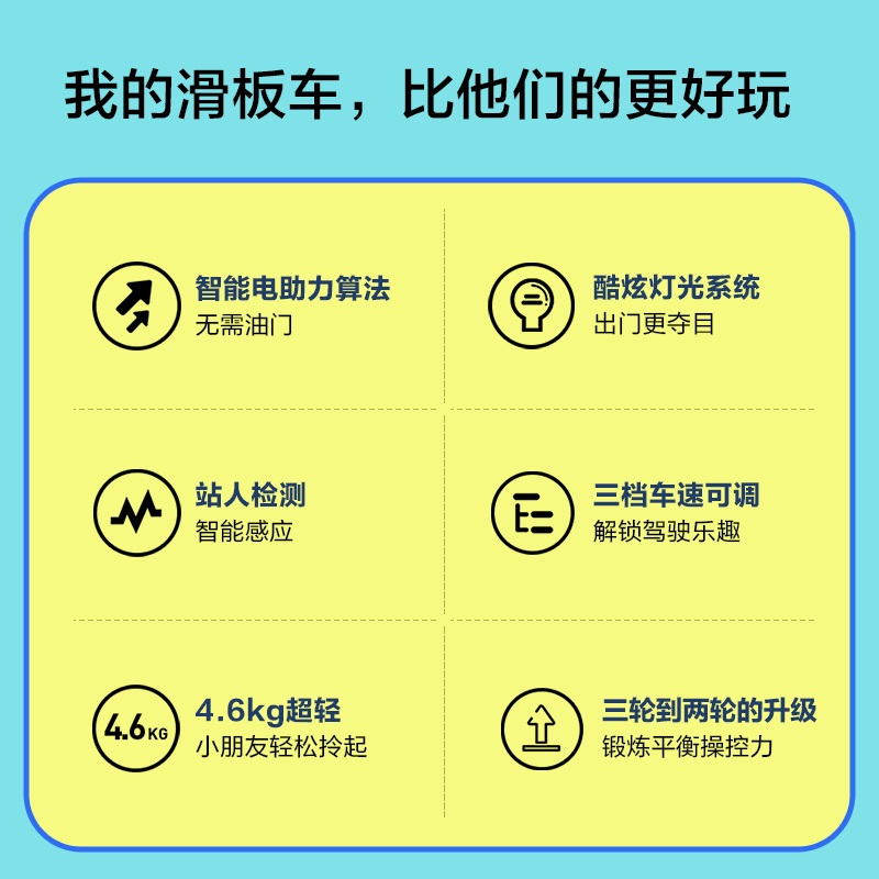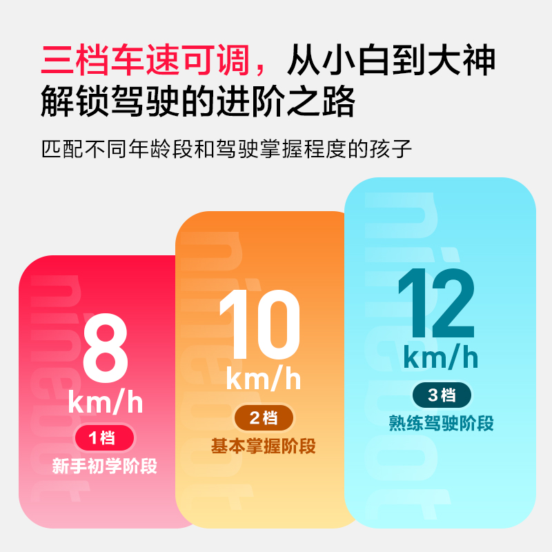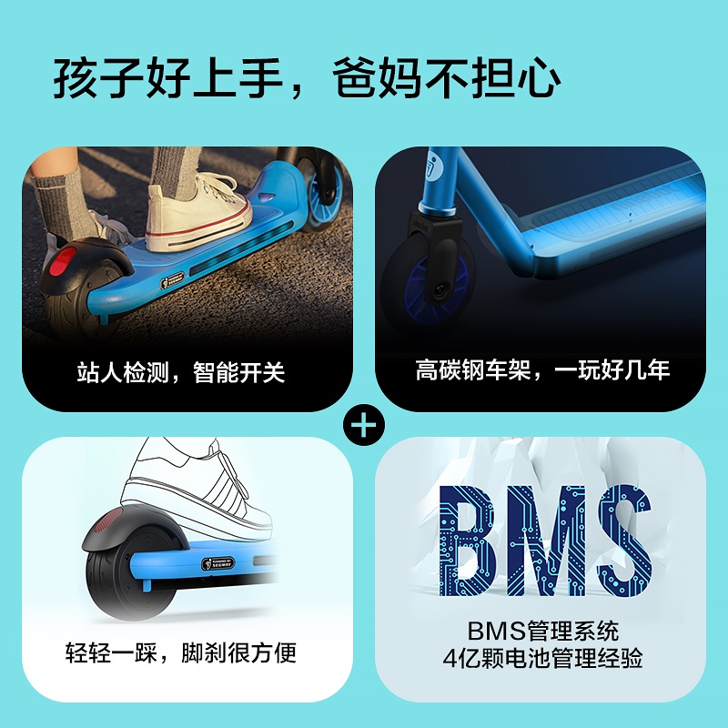感式脚踏开关,踩上自动开机,蹬行即可启动延续孩子即滑即走的使用习惯,下车自动切断动力输出,轻松操控的同时,也更加安全。三档车速可调,掌握宝贝的安全速度。BMS管理系统累计3亿颗电池管理经验时刻严密监控电池工作状态,并设置多重保护,如过充过放、过热过流等。