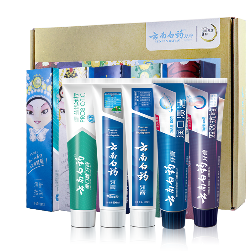云南白药牙膏,含有特有的药物活性成分,能促进牙龈血液循环,长期使用可以防止牙龈出血,预防牙周炎、牙龈萎缩等口腔疾病。此套装包含留兰100g+冬青100g+双效抗敏100g+冰凝薄荷100g+润口渍清100g,共5支。