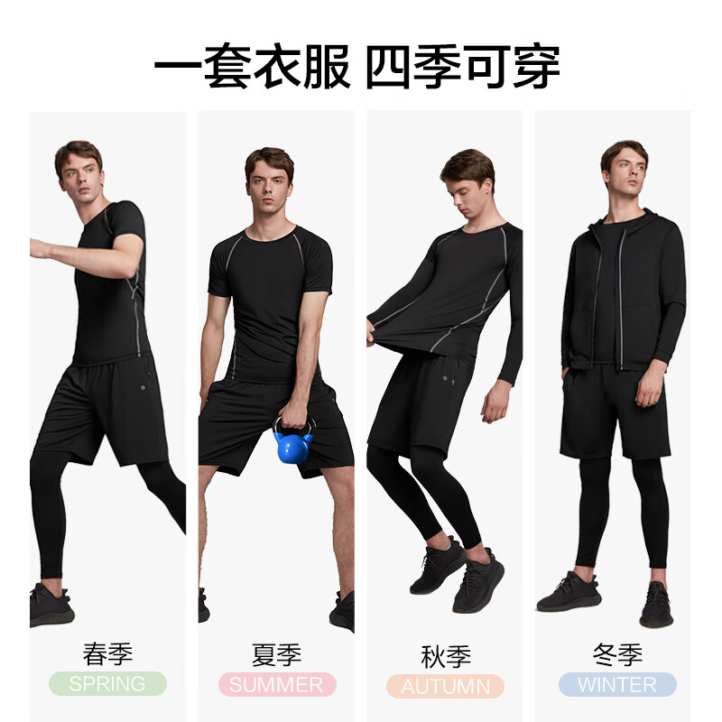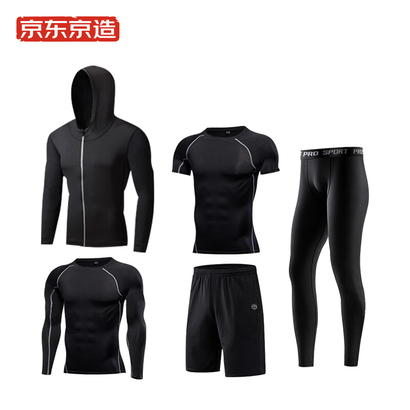 京东京造 男运动套装五件套 ,内含外套、紧身长袖T恤、紧身短袖T恤、紧身裤、运动短裤,一套衣服四季皆可穿。衣服采用微孔快干科技,穿着吸湿透气,清爽自如。