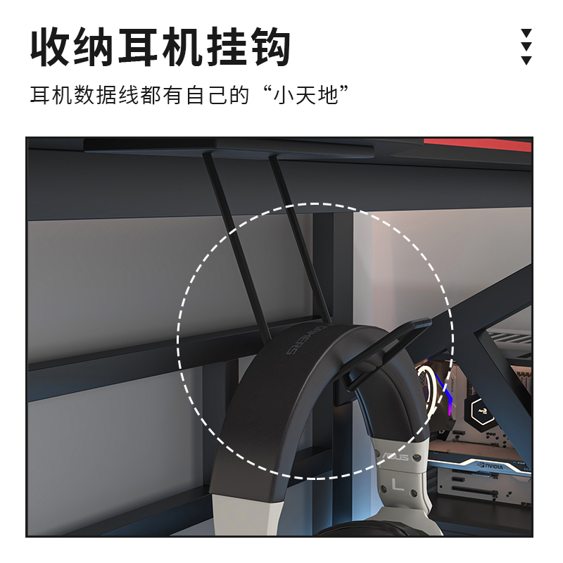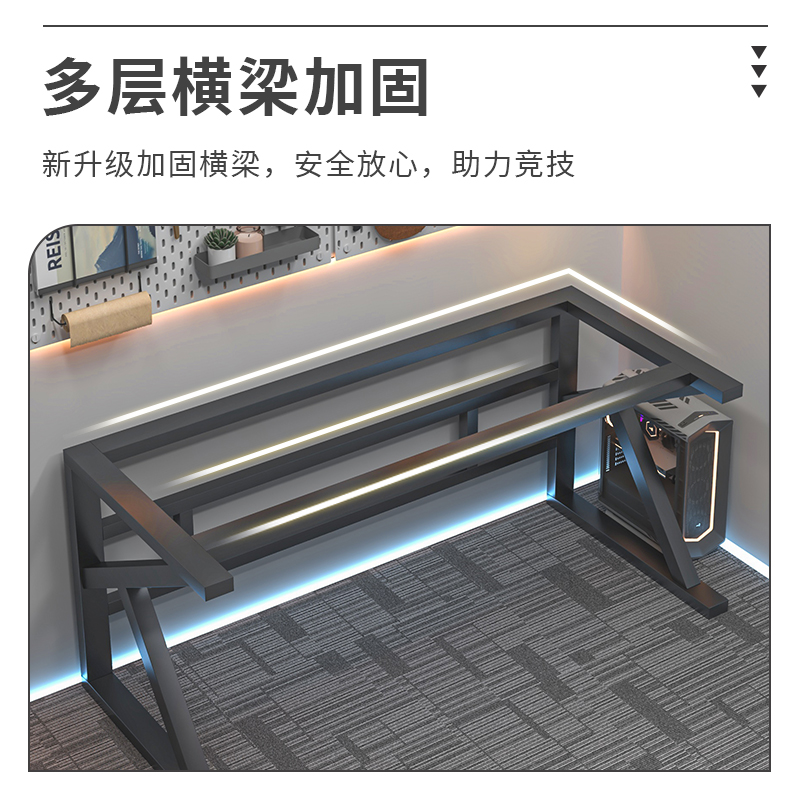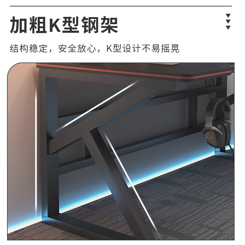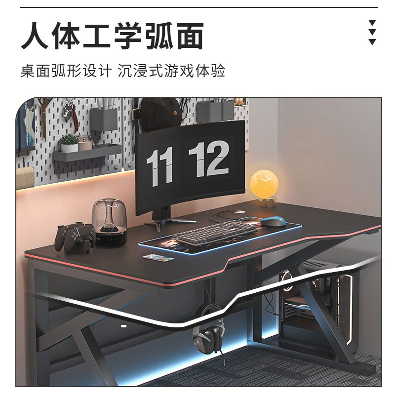 人体工学弧面,桌面弧形设计,沉浸式游戏体验。结构稳定,安全放心,K型设计不易摇晃。新升级加固横梁,安全放心,助力竞技。宽大桌面,任意摆放,驰骋电竞不将就。