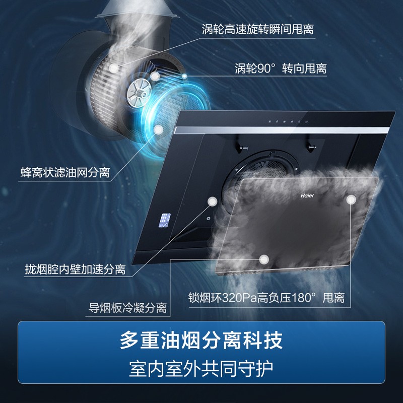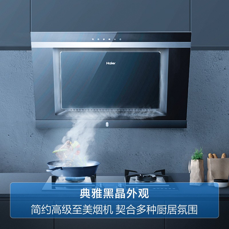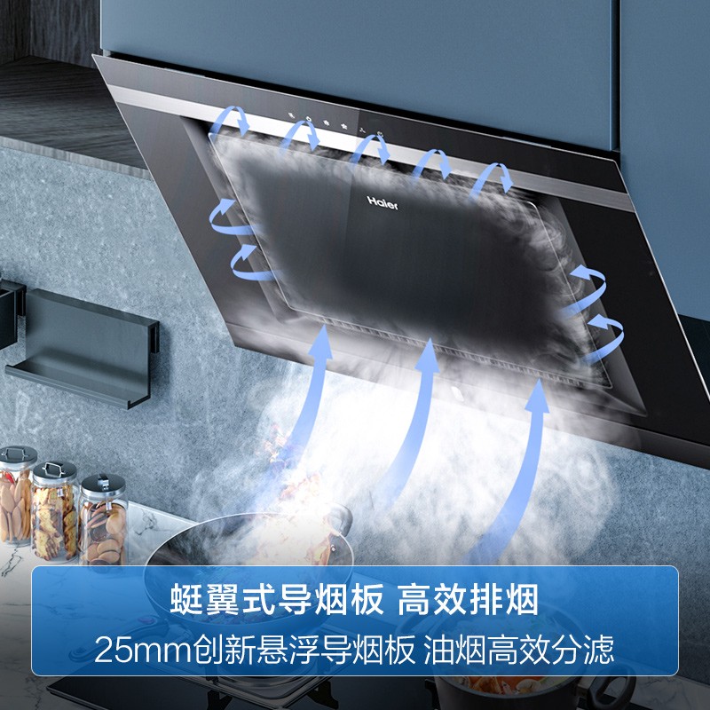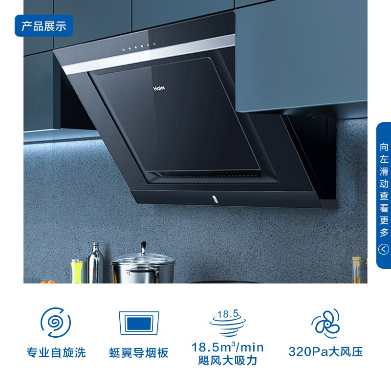 这款海尔 E800C6J型号侧吸油烟机,风量排风量15 m3/min,风压大于230Pa,油脂分离率86%,120摄氏度高温自净芯,第三代不沾油防污网。