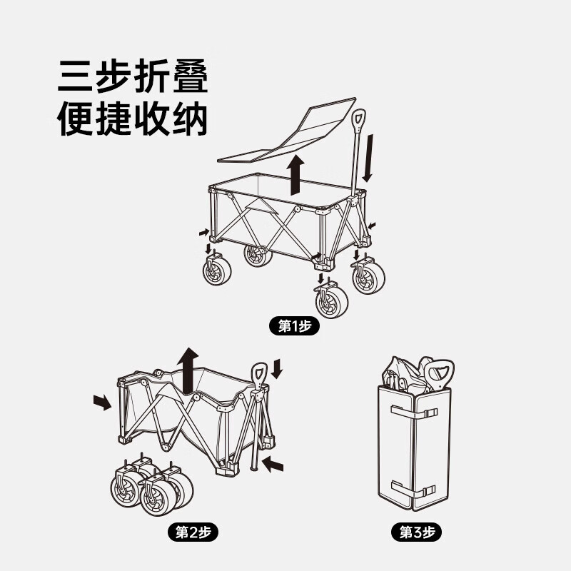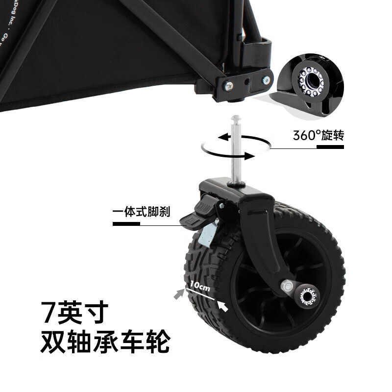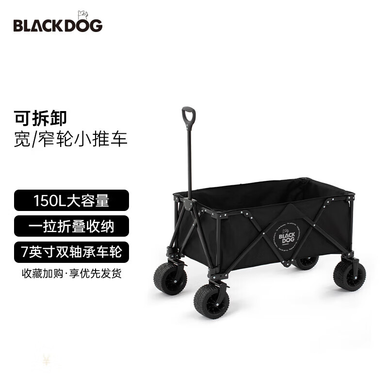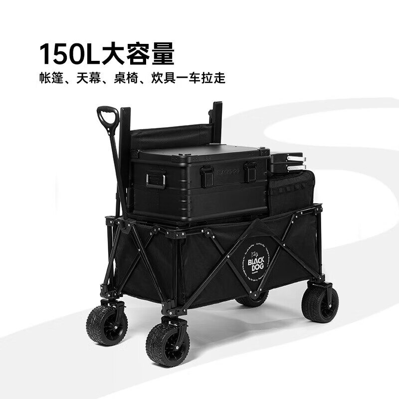 Blackdog 黑狗 户外露营车 BD-TC002,采用150L大容量,120KG承重,双轴承车轮,前侧双轮采用360°万向轮,拥有10颗万向珠子轴承,使推车转向灵活,全地形车胎搭配顺滑轴承,推拉更省力,一体式车刹,即停即刹,可拆卸车轮,可单独收纳。自由伸缩式推拉手柄,有伸缩按钮,可上下调节手柄。