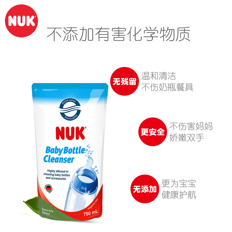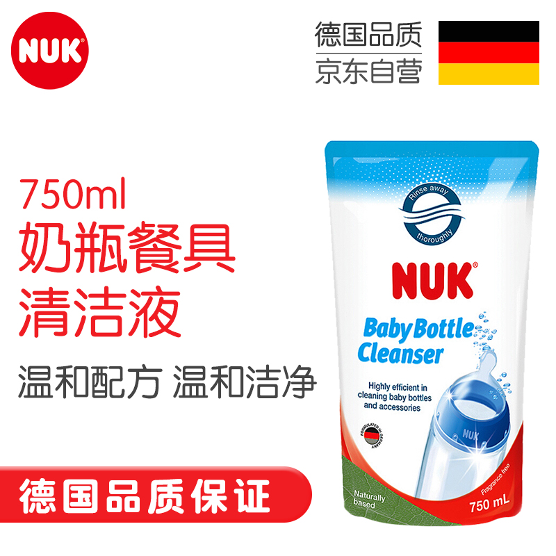 NUK 奶瓶奶嘴清洗液 750ml 补充装,天然温和,无香植物配方。如水样质地,更少化学添加,使用更安心。绿色环保,可自然降解,易冲洗无残留。泡沫丰富,轻松瓦解各种污渍,用量更省,去污力强。不伤器具、不伤手