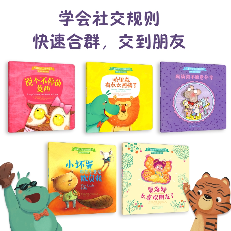我有很多好朋友系列解决了孩子普遍存在的10个社交小毛病——个人空间、倾听、说谎、过度社交、害羞、自私、输不起、欺负、嫉妒、社恐。生动可爱的小动物,是这5册书中的主角,他们有自己的脾气和烦恼,但是通过老师、朋友的帮忙,以及自己的努力,积极地改正了这些小毛病。画风可爱,温馨,故事情节贴近孩子的生活,代入感强,以小动物为主角,避免了阅读时的抵触情绪。