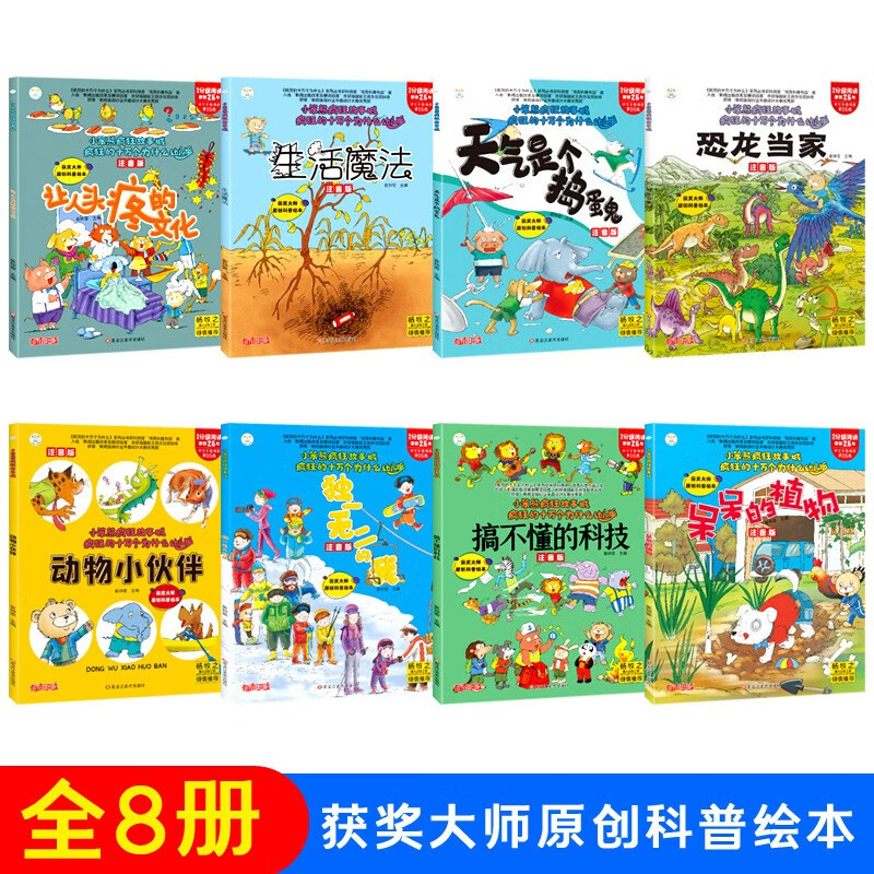 这是一套获奖大师原创科普绘本,用轻松幽默的故事讲述科普知识。专门针对3-6岁孩子策划,全套8册,分为8大主题,由4位出版界大咖花费3年时间倾力打造,内容涉及动物、植物、恐龙、天气、人体、生活、科技、文化八大热点领域。