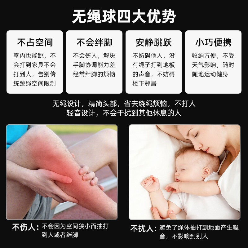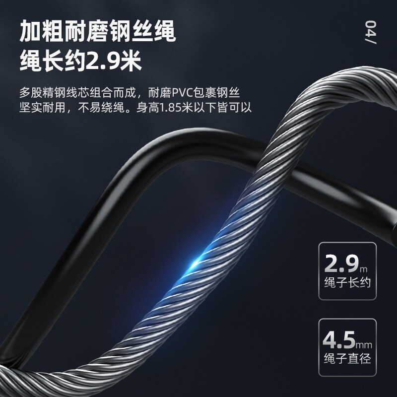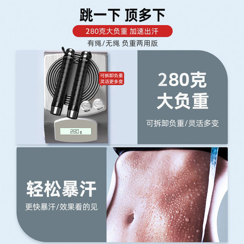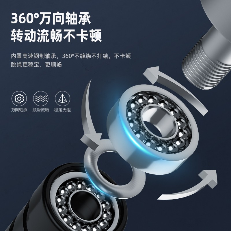手柄搭载可拆卸负重块,专业级/入门级随时切换。无绳球解决空间/绊脚/伤人的难题不打人,静音设计。钢丝长绳加粗pC包裹钢丝长绳可调节长短。可拆卸负重块负重块可自由拆装,两种训练方式,让跳绳运动由浅入深。360°轴承不饶绳,不卡顿,速度更流畅享受丝滑跳动体验