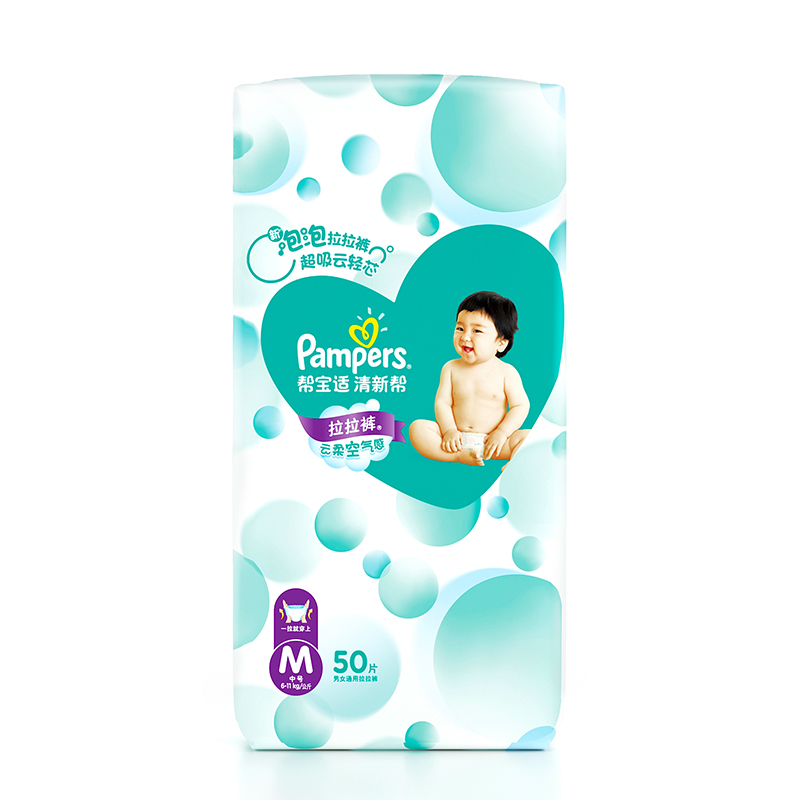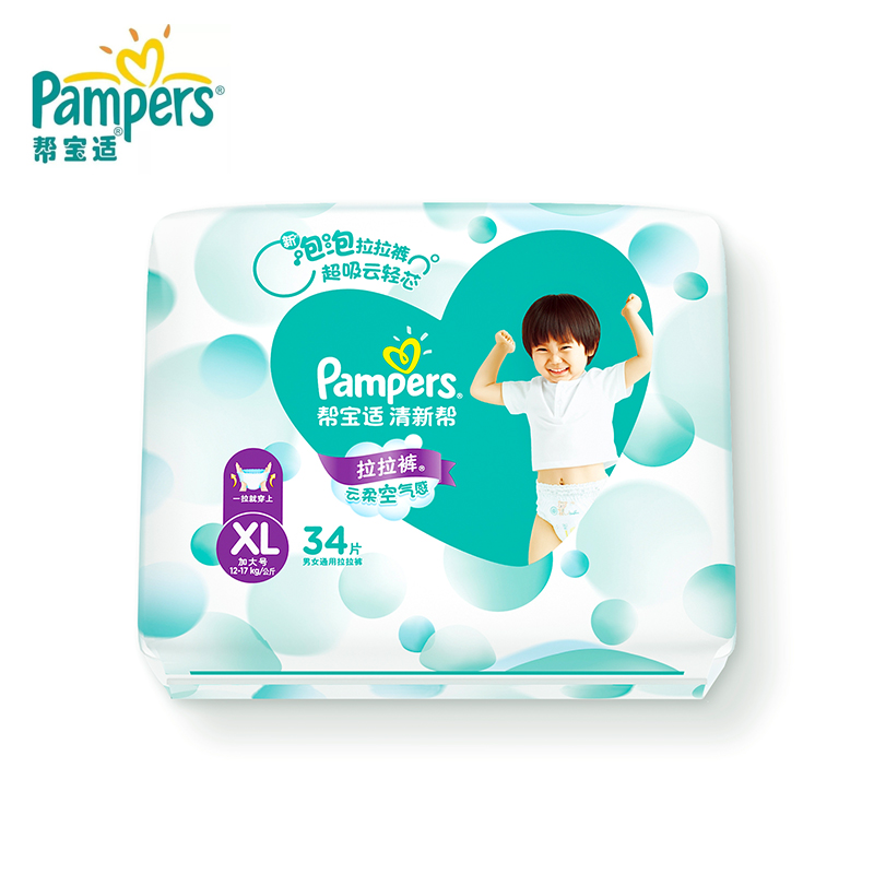 Pampers帮宝适是宝洁旗下婴儿用品品牌,为每个成长阶段的宝宝打造了不同纸尿裤,包括特级棉柔纸尿裤、超薄干爽纸尿裤和轻松穿拉拉裤。这款干爽系列拉拉裤,全弹力腰围设计。帮宝适旗下纸尿裤最新系列——清新帮,采用云柔泡泡透气层设计,不闷热,云触感材质,柔软如云朵。高分子吸水珠珠,瞬吸干爽,轻盈柔韧芯体,自在随心动。收口采用透气小云窗表层,6000+呼吸孔赶走闷热,云触表层透软亲肤,透气干爽长达12小时,特有S曲线侧腰围,不易摩擦,不勒肉。