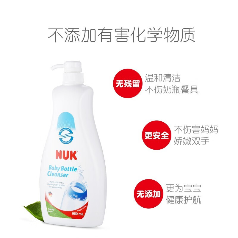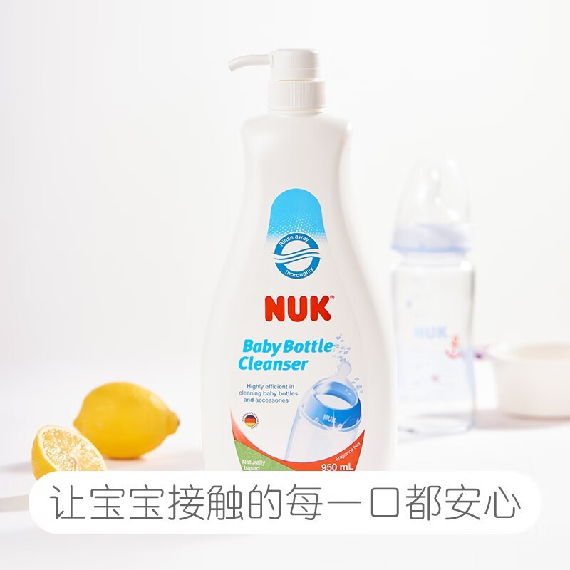 NUK 奶瓶奶嘴清洗液 ,天然温和,无香植物配方。如水样质地,更少化学添加,使用更安心。绿色环保,可自然降解,易冲洗无残留,泡沫丰富,轻松瓦解各种污渍,用量更省,去污力强。不伤器具、不伤手。