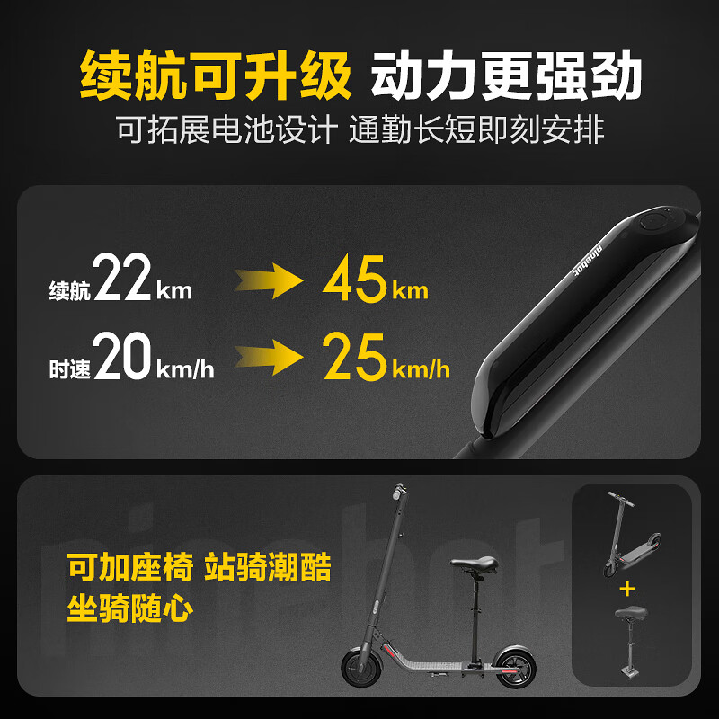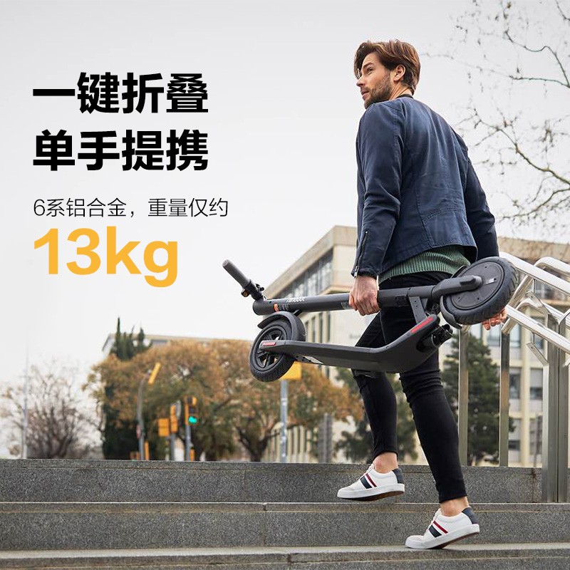 Ninebot 九号 E22 电动滑板车,一体式车架设计,简约时尚,BMS智能管理系统,9英寸高弹减震轮胎,22KM长续航,300W霍尔无刷直流电机,20km/h时速,15%爬坡能力,2.5W高亮LED灯,13.5米照射距离,行驶更安全。