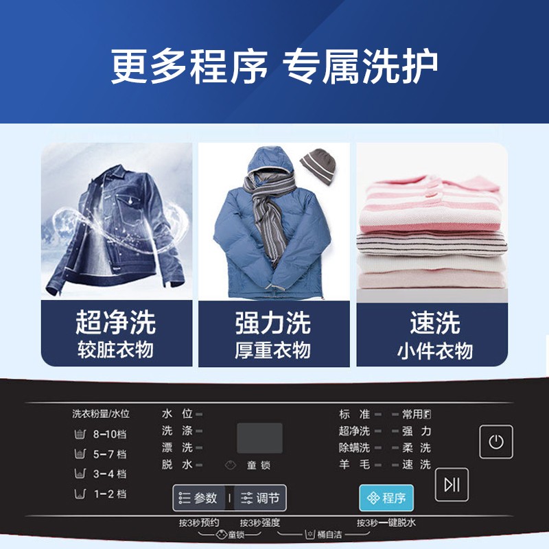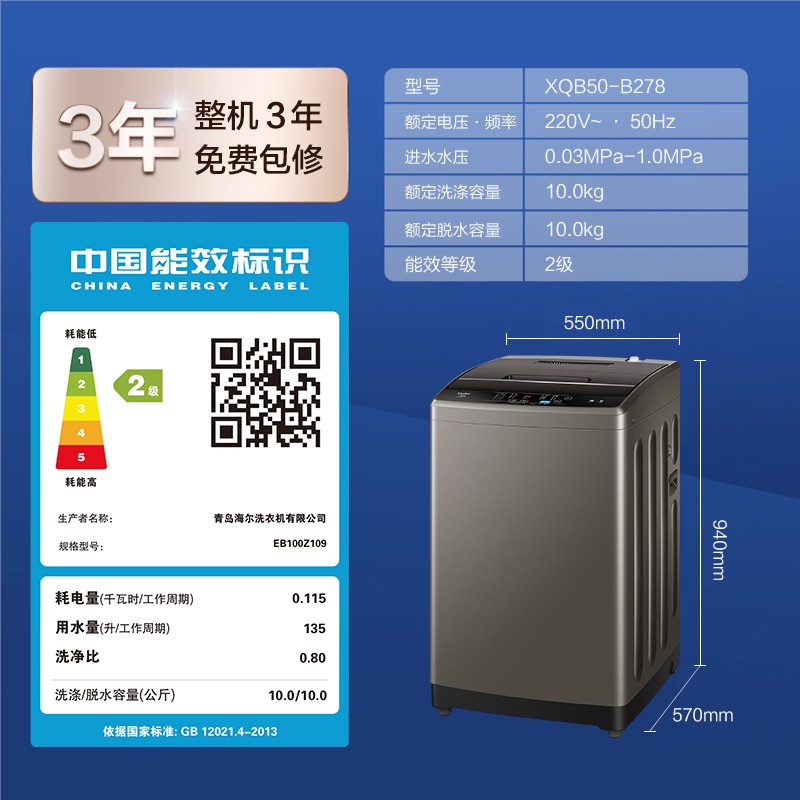 海尔EB100Z109 波轮洗衣机 10KG,采用高品质电机运行平稳,使用持久。可自由调节洗涤参数,多档水位,洗涤时间,漂洗次数和脱水时间可选。支持除螨功能。漂甩二合一,有效排除深层泡沫。内筒带有光滑凸起,避免划伤衣物。采用抗菌波轮,抑制细菌滋生。支持内筒自清洁,通过高速旋转的水流清洗内外筒壁,避免二次污染。支持预约洗衣采用下排水方式,洗涤功率465w,脱水功率395w。