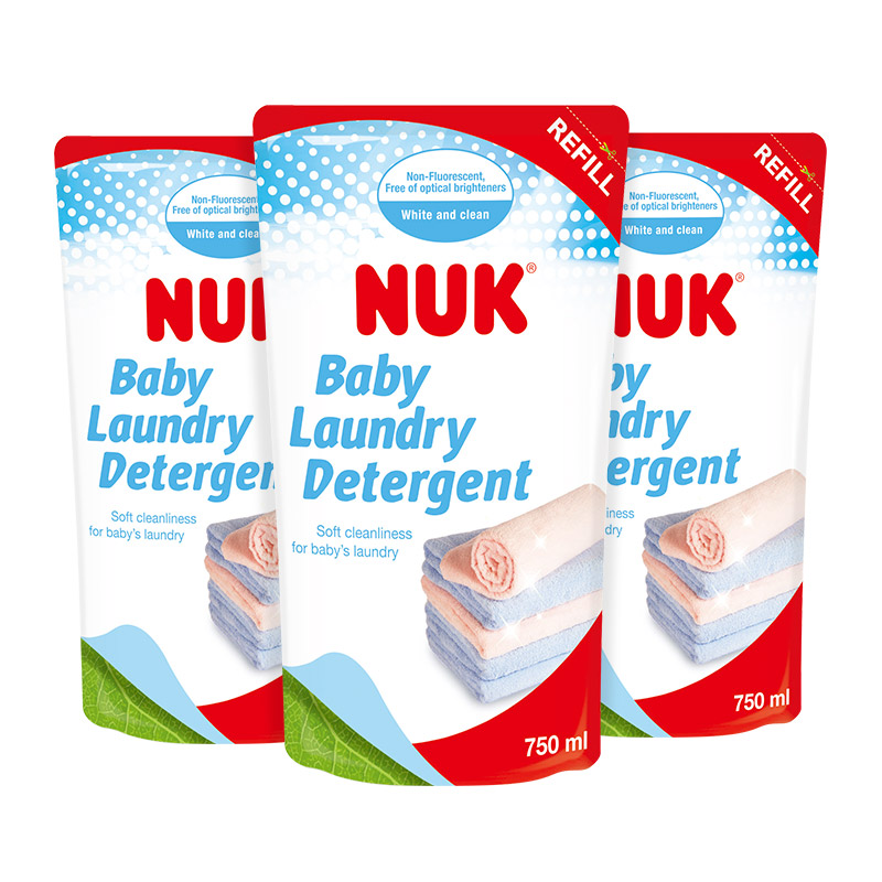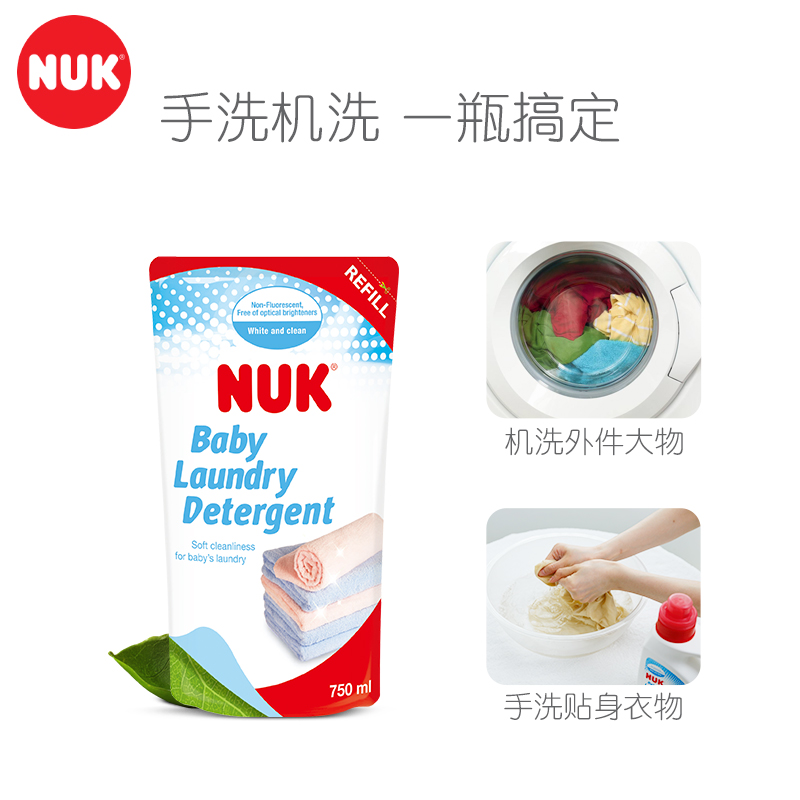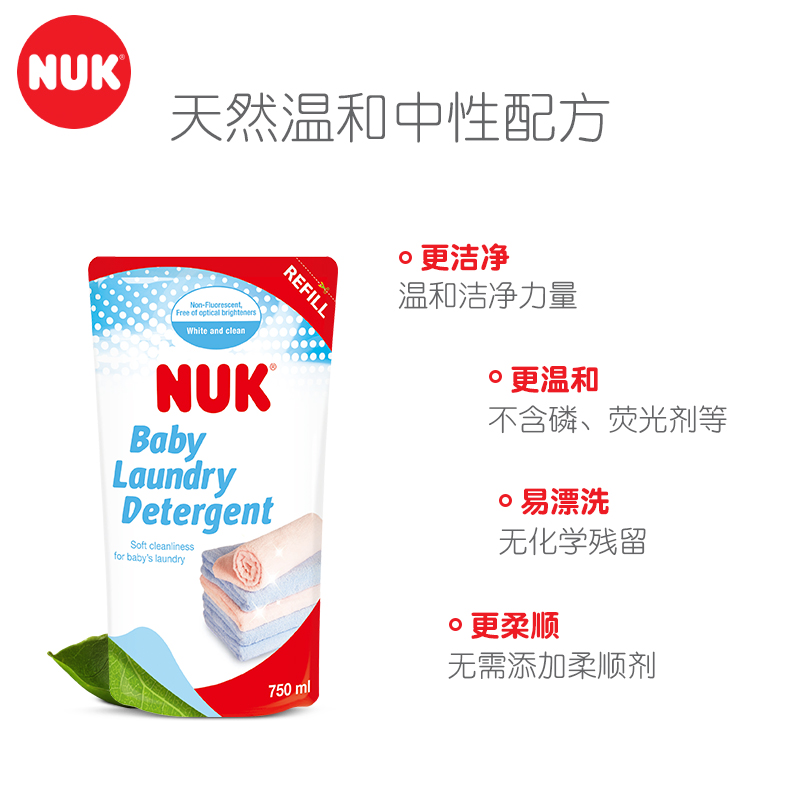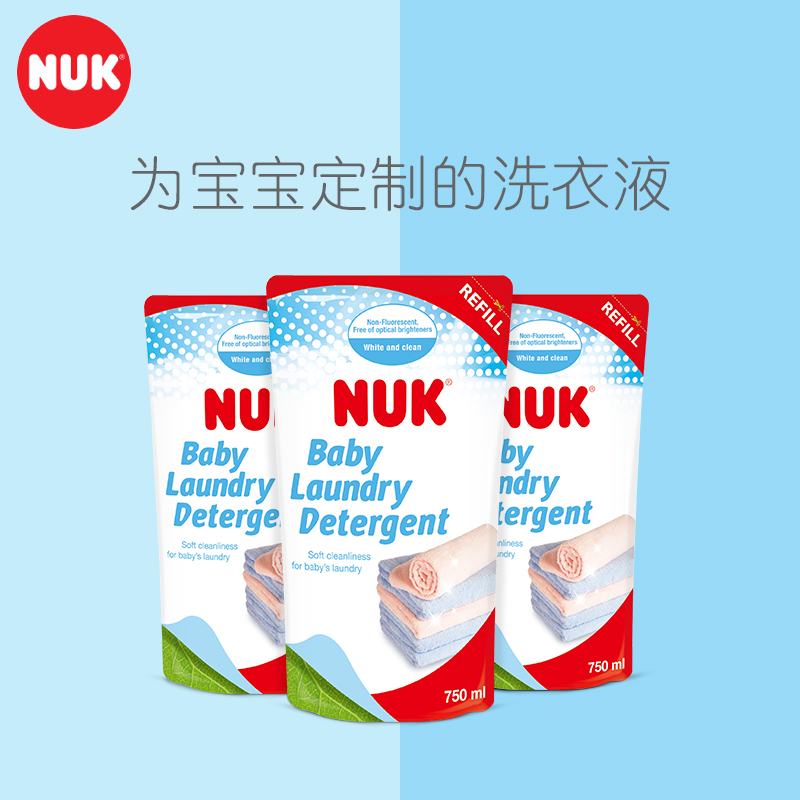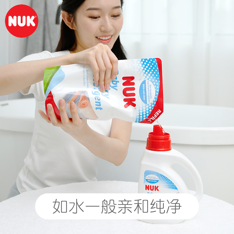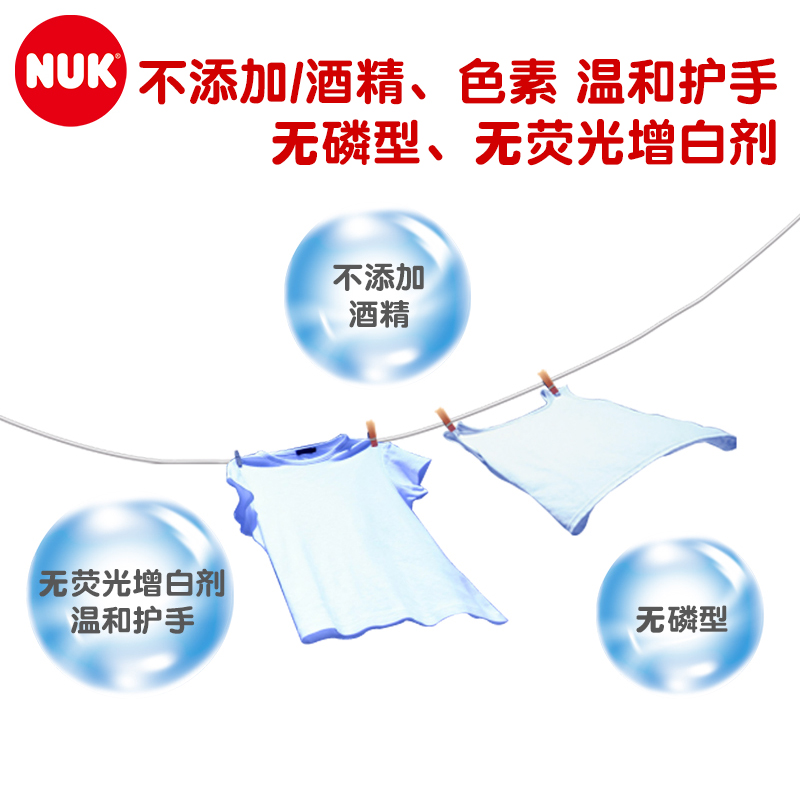 NUK 婴儿洗衣液,产地台湾,主要成分为特殊洗净界面活剂和抗菌剂,不含磷、荧光剂、漂白剂等,酸碱值为中性,温和不伤手,洁净力强,易于漂洗,衣服洗后柔软舒适,尤其适用于婴幼儿的衣物,1000ml袋装。