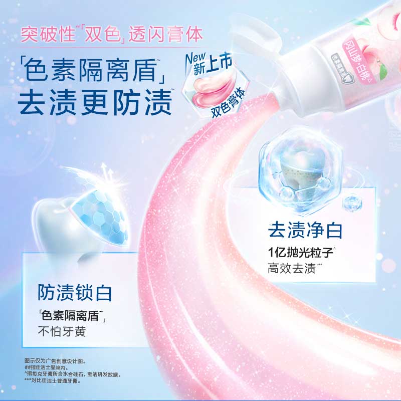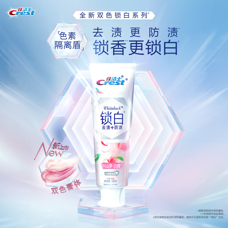 佳洁士全新锁白系列,炫白牙齿锁得住,想牙齿长期保持亮白,不能只去渍还能锁白,1亿抛光粒子,赶出牙齿表面牙渍,锁白成分附着齿面形成安全保护伞。口感清爽,花香满溢,让你保持一天好心情。