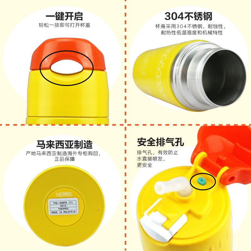 THERMOS 膳魔师 FHL-400FB-Y 儿童吸管保温杯 400ml 黄色米菲 采用备受喜爱的卡通形象,大人小孩都爱不释手,易握杯身,随心出行,随时补水。内胆采用双层抽真空技术,有效阻隔温度传导及对流,更有效保冷。