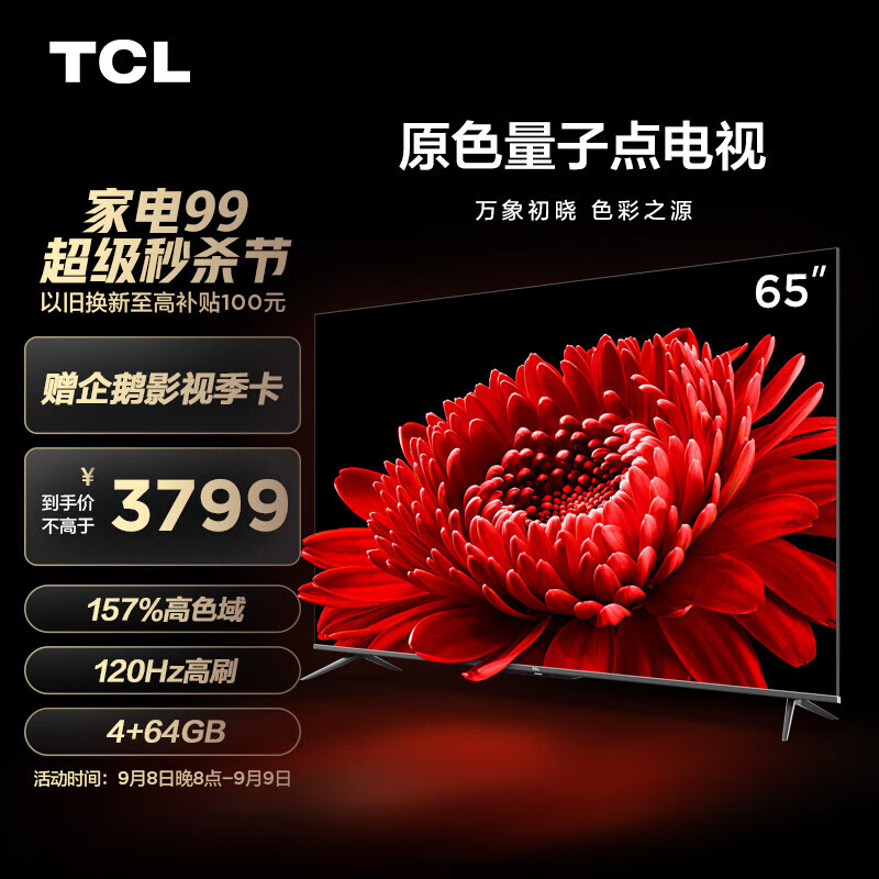 TCL T8E-MAX系列 液晶电视,搭载第六代原色量子点,将鲜艳而纯净的颜色呈现出来,色纯度比普通电视提升58.3%,色准值△E<2,确保颜色显示的准确性,量子点电视的显示稳定可靠,不易褪色,寿命长达 60000小时。支持一键开启120Hz疾速刷新模式,搭配120Hz MEMC,让画面流畅无拖尾。支持杜比视界和杜比全景声,配合Conchs Sound音响,带来震撼观影体验。