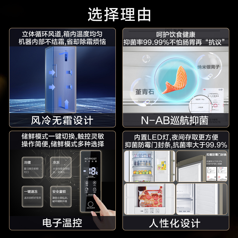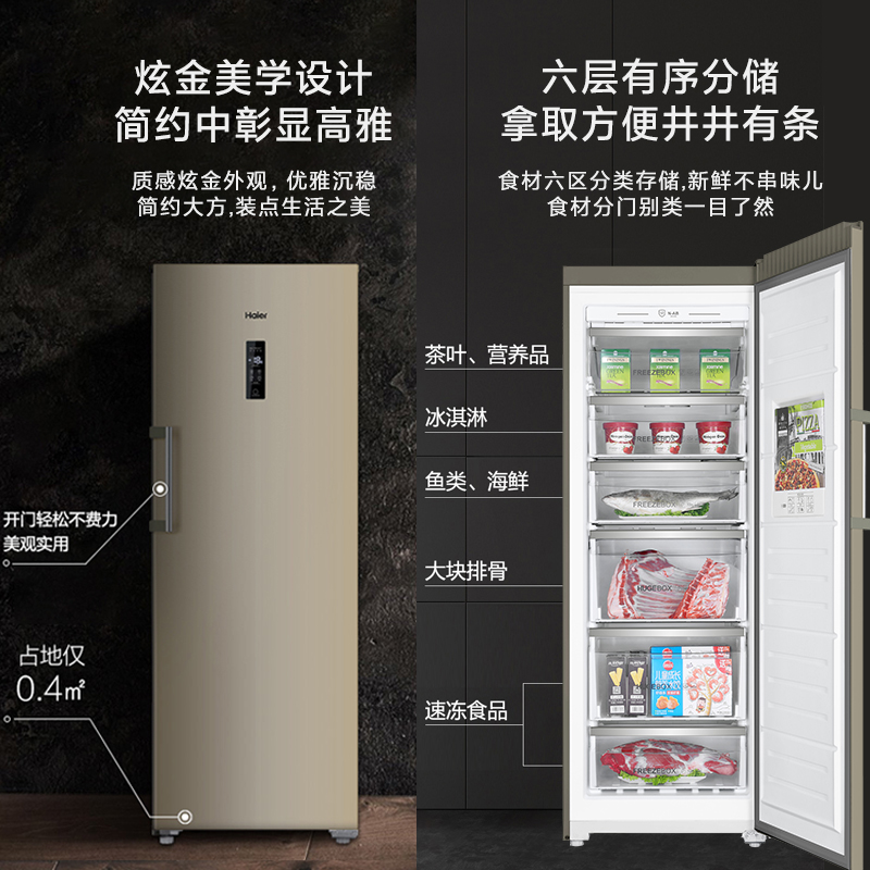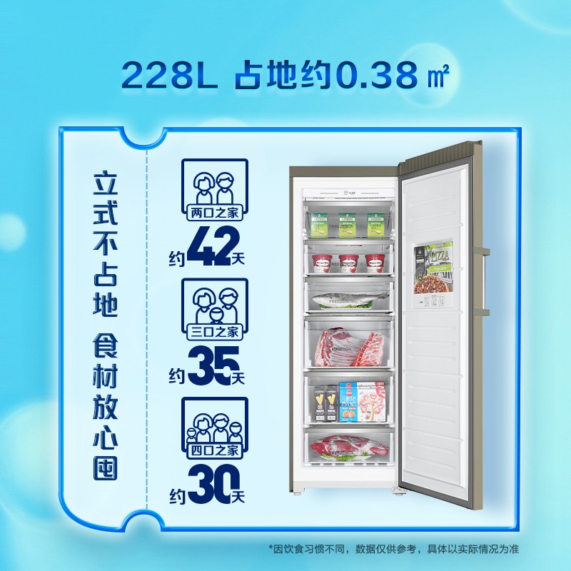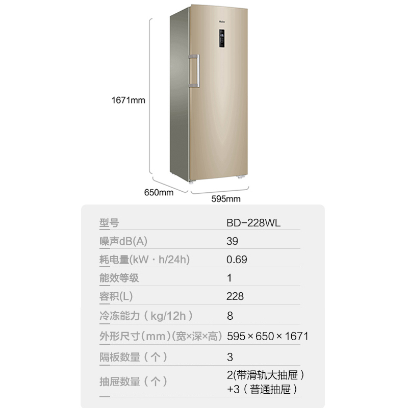 海尔(Haier)这款型号为BD-228WL的单门立式冷柜,容量228升,支持冷藏冷冻双切换,储鲜模式一键转换,冷藏冷冻随心选择。内部设计了立体循环风道,保证内室温度均匀。制冷方式为风冷,有效避免结霜,省去除霜烦恼。冰箱冷冻能力达8KG/12H,日耗电量0.69KW/H,达到了1级能效标准。带有N-AB巡航抑菌功能,有效抑菌99.99%。