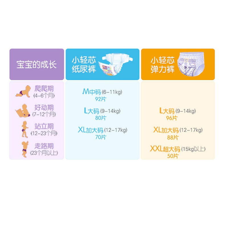 安尔乐Anerla是国内较为知名的卫生巾和婴儿纸尿裤品牌,这款小轻芯纸尿裤轻薄熟悉你,穿脱自如,弹力柔软。甄选安全材质,双立体打孔棉层,360度柔软弹力腰围,穿脱自如。薄至1mm,双重锁水,pp时刻保持干爽。防侧漏设计,不怕漏尿,贴合宝宝身体。双立体打孔面层,减少与皮肤接触面积,增加气流空间。