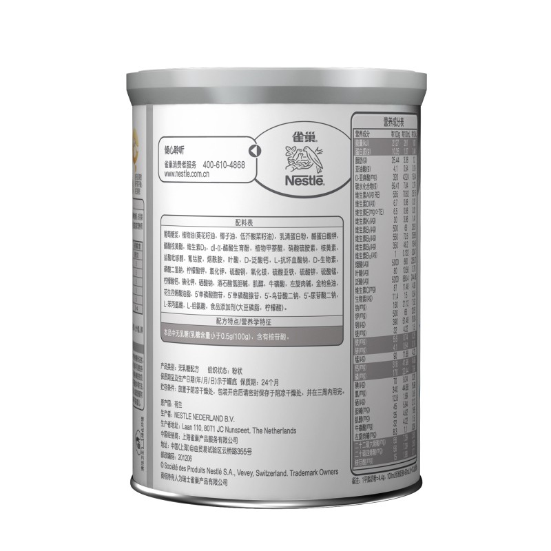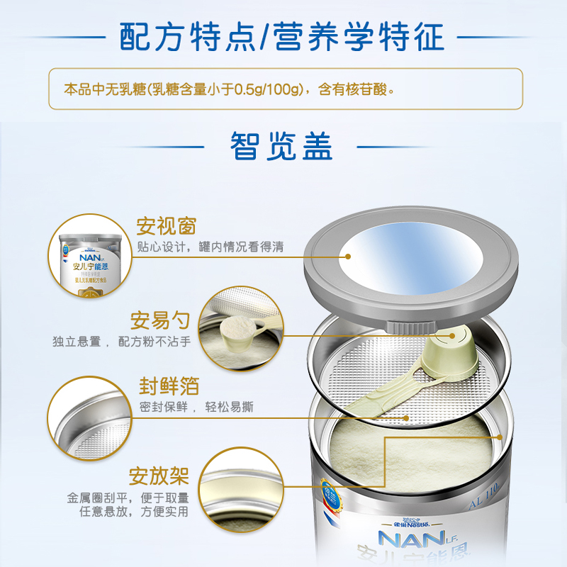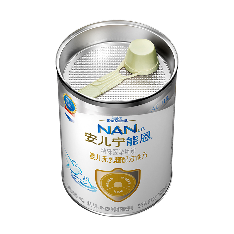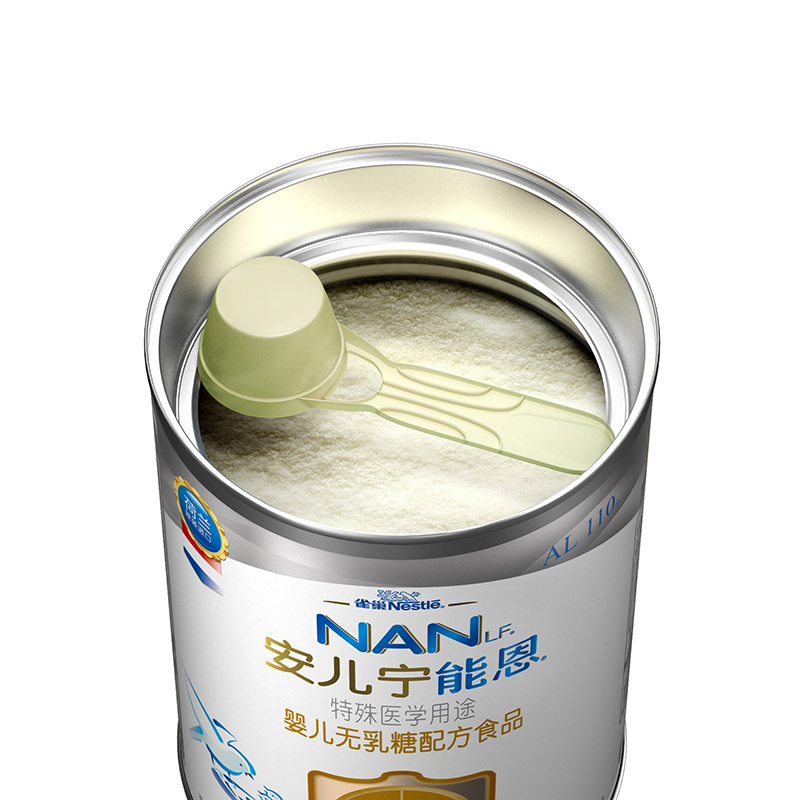 Nestlé 雀巢 能恩 AL110 无乳糖营养配方奶粉 400g是一种特殊的婴儿配方奶粉,适用于少数先天对牛奶蛋白或乳糖过敏的,因乳糖无法耐受而引起腹泻的婴儿。主要是将普通奶粉中的乳糖以麦芽煳精或葡萄糖聚合物取代,且在蛋白质上亦做了调整,由于这些奶粉在营养上与其他婴儿奶粉并无差异,是婴儿腹泻期可以放心食用的特殊配方奶粉,建议家中常备一罐。