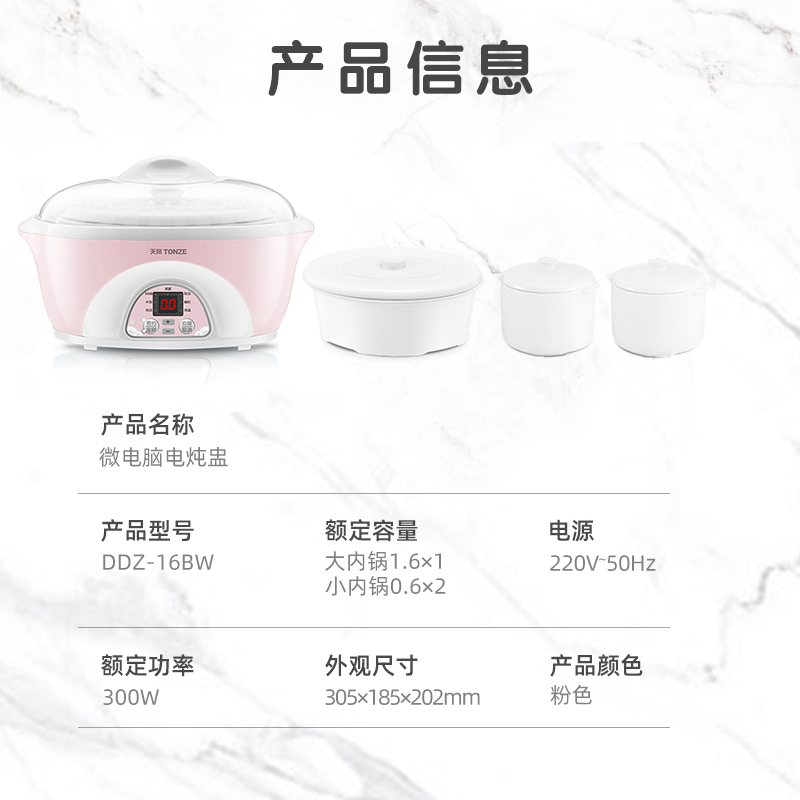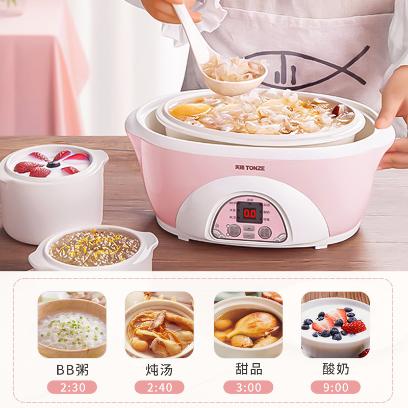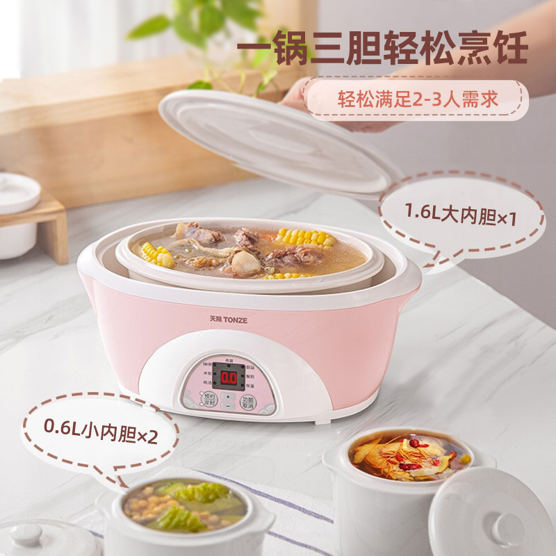 天际是国内专业做电炖锅的牌子,这款DDZ-16BW 隔水电炖锅最大容量为1.6L,带有不同大小3个白瓷内胆。额定功率为300w,多种模式可选,支持预约、定时,使用方便。