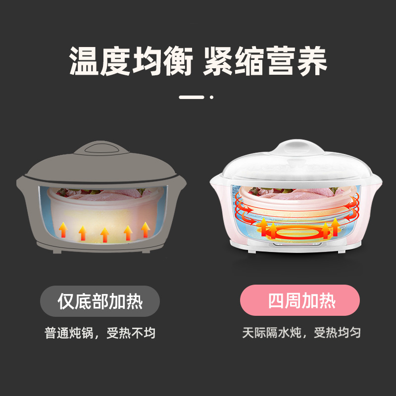 蒸炖双全好营养,多功能,带给全家营养呵户,两种搭配,家用待客都满足,丰盛好莒养,蒸炖同步,上蒸下炖,一次可做多样菜,高温陶瓷內胆,健康陶瓷工艺,取材天然,盛放食物更环保,健康。