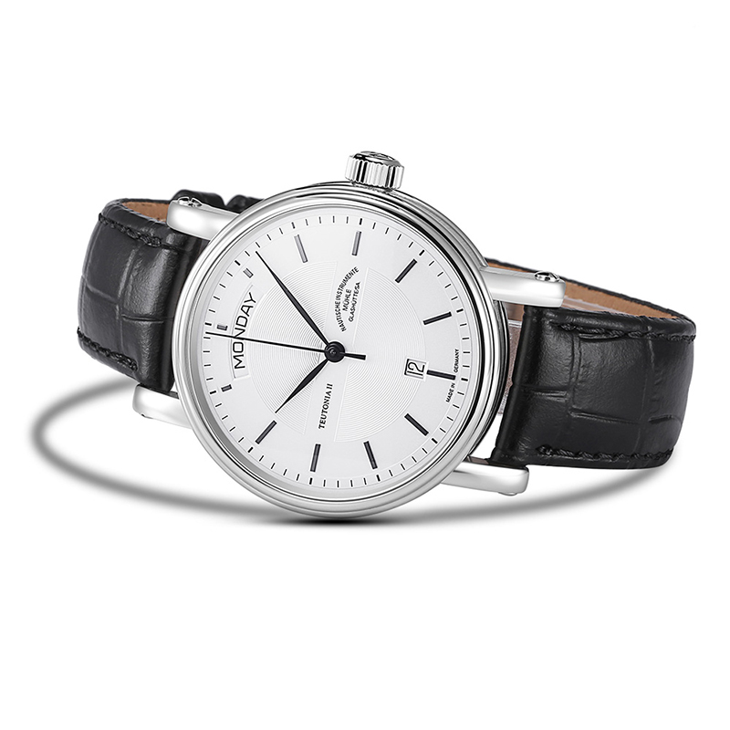 采用简洁的银色表盘镶嵌黑色柳叶针与竖状刻度,大窗口日期/星期展示,实属成熟稳重商务男士,表壳采用拉丝哑光处理,表壳側面沿袭德表的传统直线线条设计。