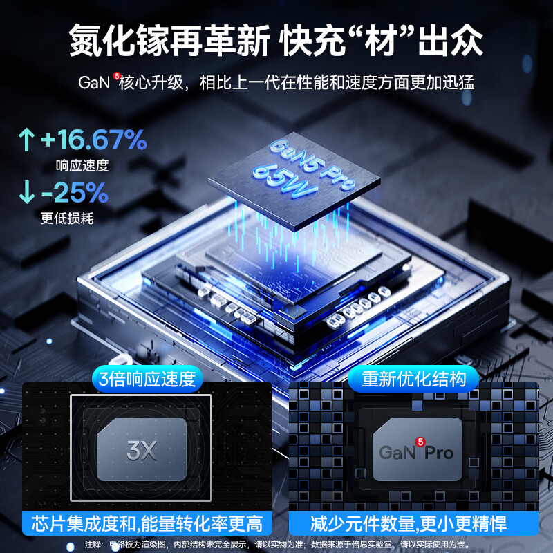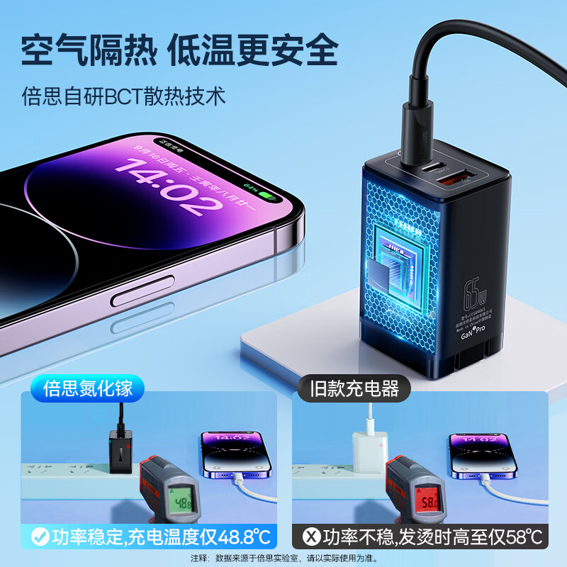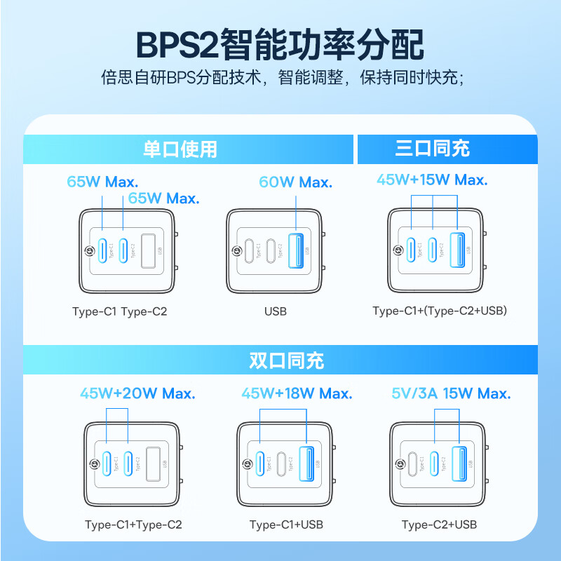 从GaN快充到GaN 2 Pro的技术升级,搭载倍思自研 BCT 散热技术,实现65W双口盲插,功率更大体积更小升更低。搭载倍思BPS II充电技术,功率动态分配,不用分辨快充口,两路都可快充。兼容PD3.0、QC4+、QC3.0、SCP、MTK 等快充协议。标配100W 5A快充线。