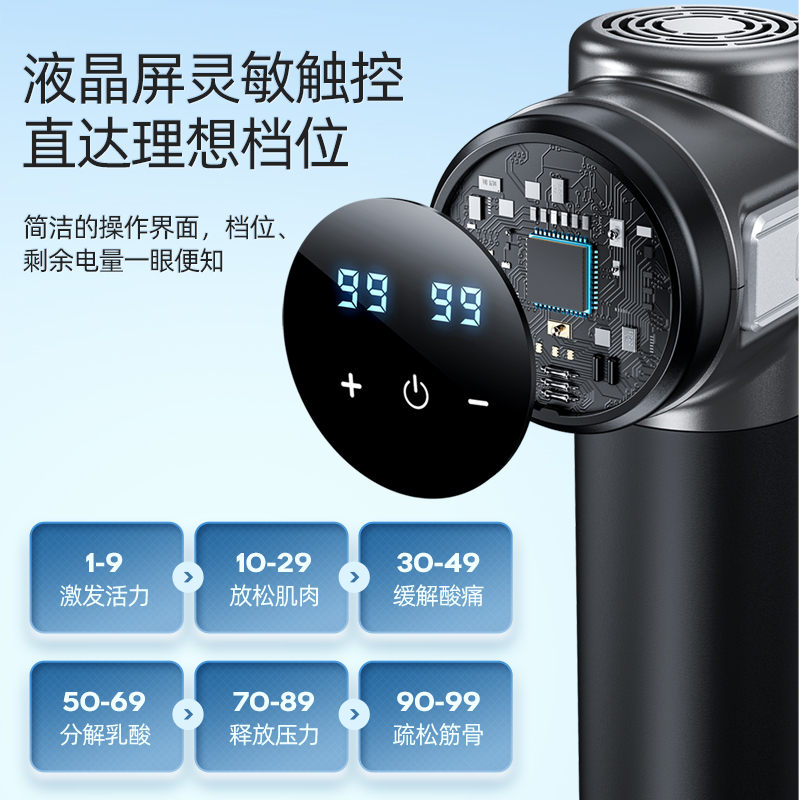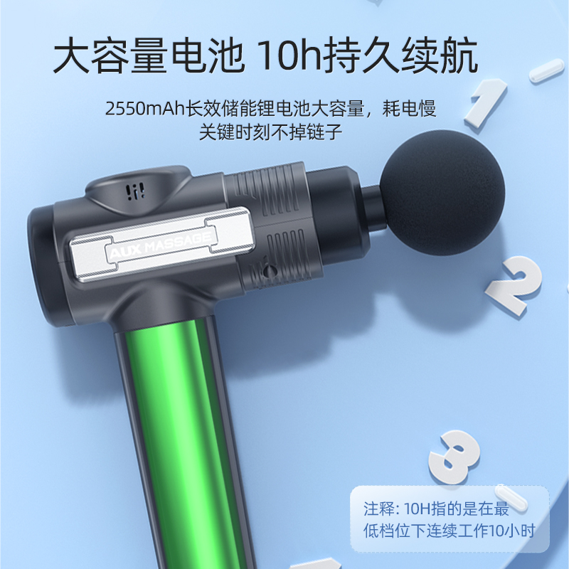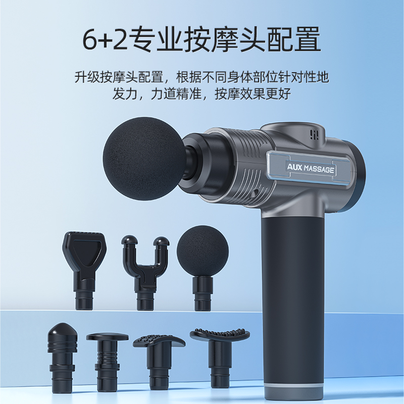 奥克斯(AUX)筋膜枪TM312,添加AI智能芯片。6800转高频震动,直达肌里深层 ,动力强劲且运行稳定。节能省电,使用2550毫安大电池,充满电可待机10天,手柄材质防汗亲肤。送8个按摩头和收纳包,99档调节,液晶触控,力度调整精细,触感灵敏。