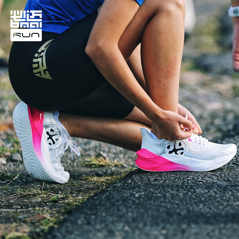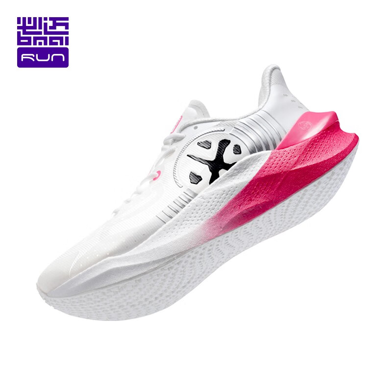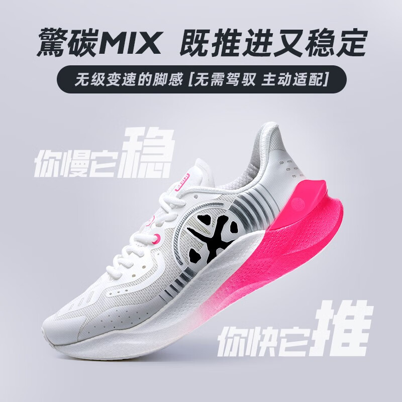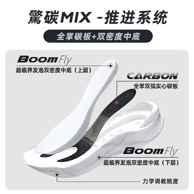 bmai 必迈 惊碳MIX 全民碳板跑鞋,全掌碳板+双密度中底结构。中底上下层均搭载Boom Fly超临界发泡双密度中底(上层),上层缓震护关节,缓震稳定,保护关节,下层韧弹担当,韧弹持久跑,马拉松后半程回弹无衰减。中间全掌双弧实心碳板,贴合脚型,提速推进更稳定。独具特色的后跟船尾式TPU结构,嵌入式贴合足跟处,给予后跟持续的稳定状态。全掌加宽鞋楦,国人脚型调校,长距离奔跑更舒适。