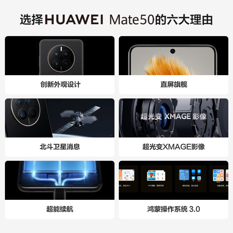 华为 Mate 50巴黎饰钉设计,更显高端优雅,有冰霜银、耀金黑、流光紫三款玻璃版本以及正面采用昆仑玻璃面板的昆仑破晓,昆仑霞光两款素皮版本,昆仑玻璃面板,整机耐摔能力得到更好的提升,获得瑞士SGS五星抗跌耐摔权威认证,整机重202g。