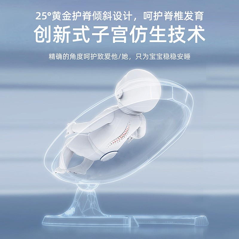 科学护脊坐深,妈妈怀抱般自然安睡,约11cm科学坐深,呵护脊椎不窝脖子。全地面接触,稳定摇摆不悬空,地面全接触,让宝宝安心进入深度睡眠。弧形轨道无极调节,拒绝滑档,坐躺调节更顺滑,睡梦中调整角度也不会惊醒宝宝。仿生蛋形座舱,全面托缚小身躯。科学重心,合理更舒适。