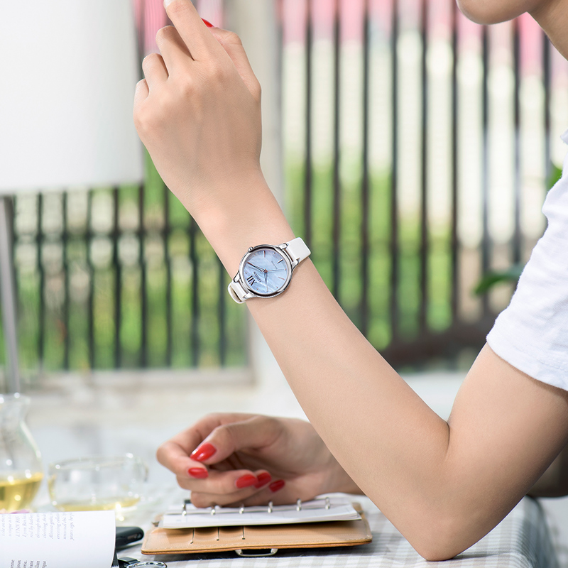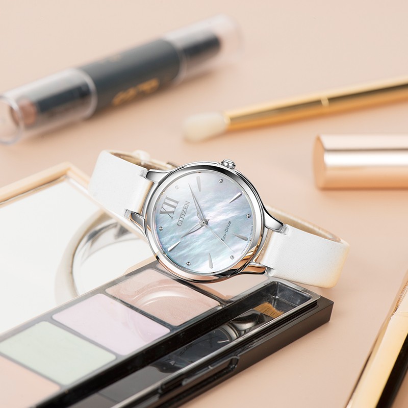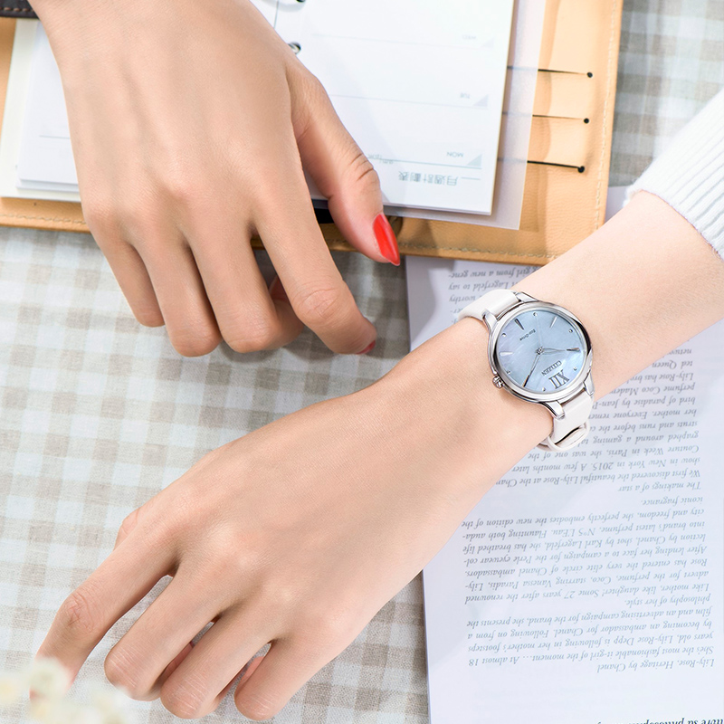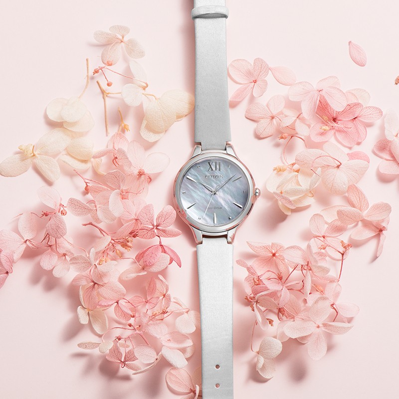 西铁城是日本著名腕表品牌,其光动能的核心技术,其可吸收任何可见光源并转化成动能,能在有任何可见光源存在的条件下都能充电,既环保又省事。Sunrise 花语风吟系列是品牌女表系列,外观主打婉约优雅气质,系列中腕表表壳结构均采用内切圆设计。这款CITIZEN 西铁城 花语风吟系列 EM0550-16N 女士光动能腕表,渐变色表盘,上有花瓣状的纹理,优雅温婉,镂空叶型指针更加精致。表径32.5毫米,9毫米厚度,球面蓝宝石玻璃,光动能E031机芯,50米防水。