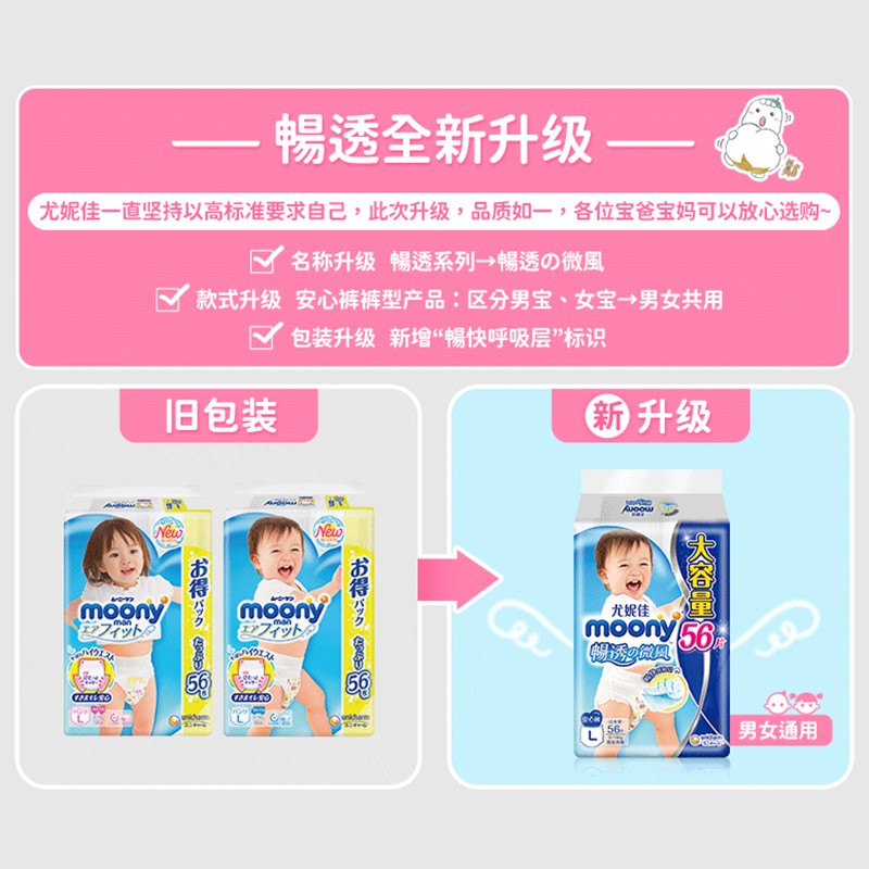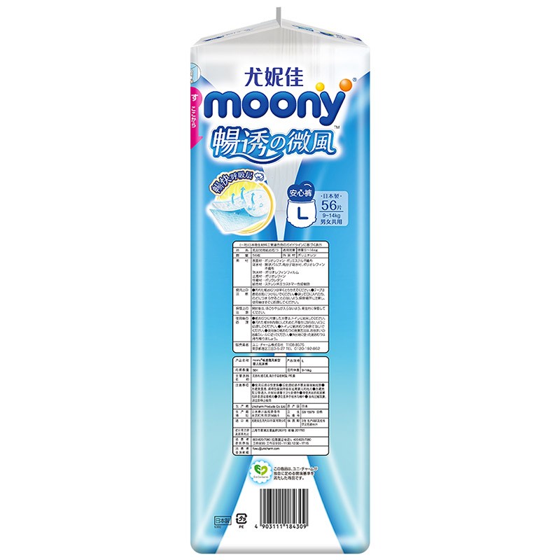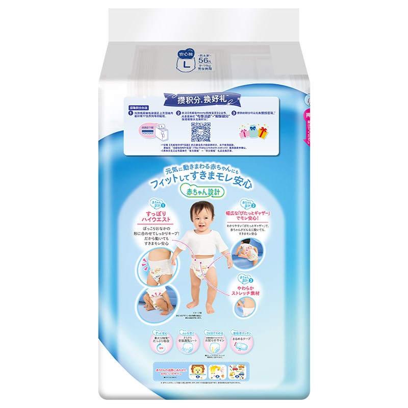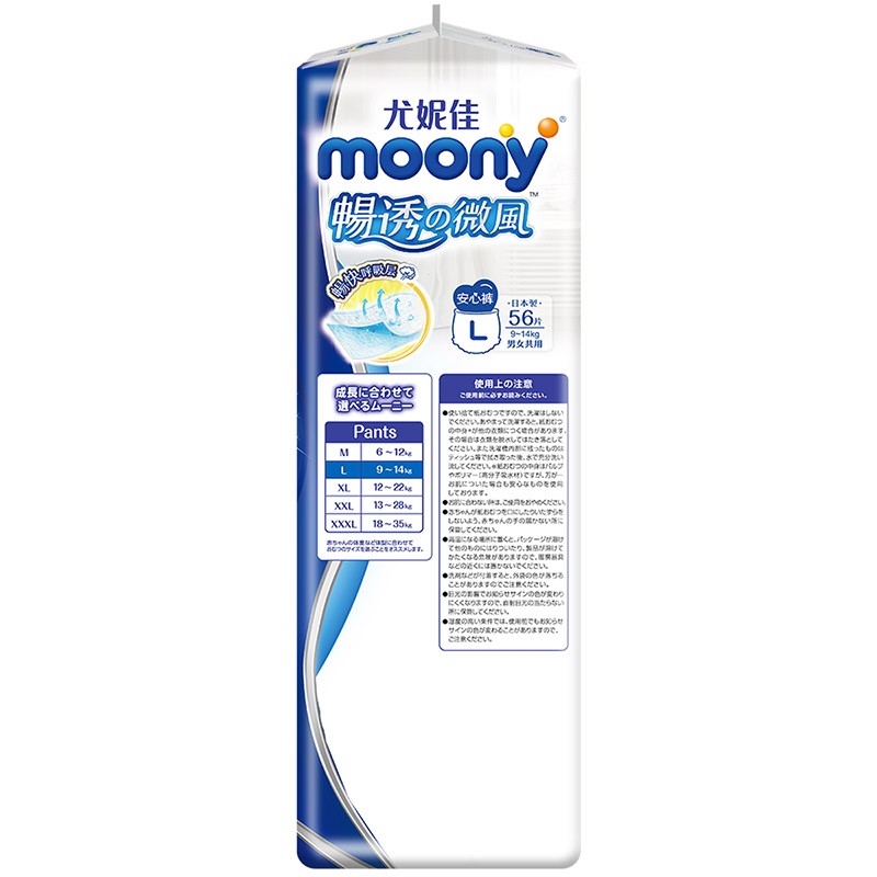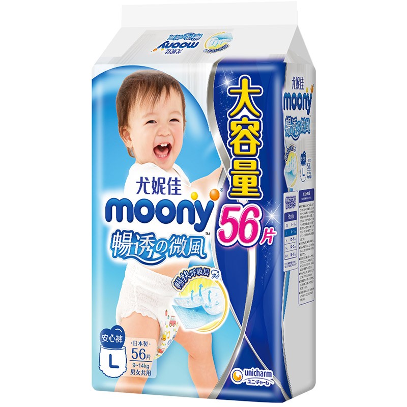 moony纸尿裤是日本尤妮佳集团旗下的纸尿裤品牌,是日本四大品牌纸尿裤之一。这款纸尿裤采用裤型设计,有效防止尿漏的情况,全面透气层设计,防止闷热,即使易出汗的宝宝,小屁屁也能干爽。腰部护围全面弹性伸缩,可以贴合宝宝后背,防止缝隙的产生,严防后漏。