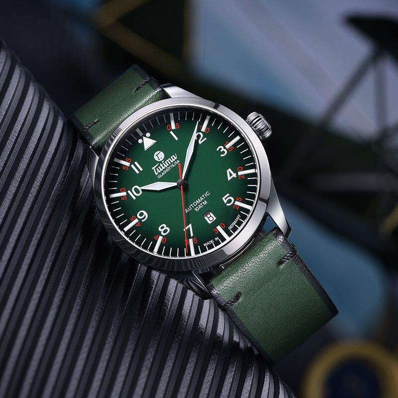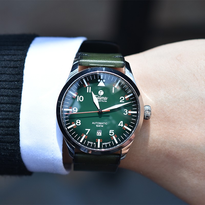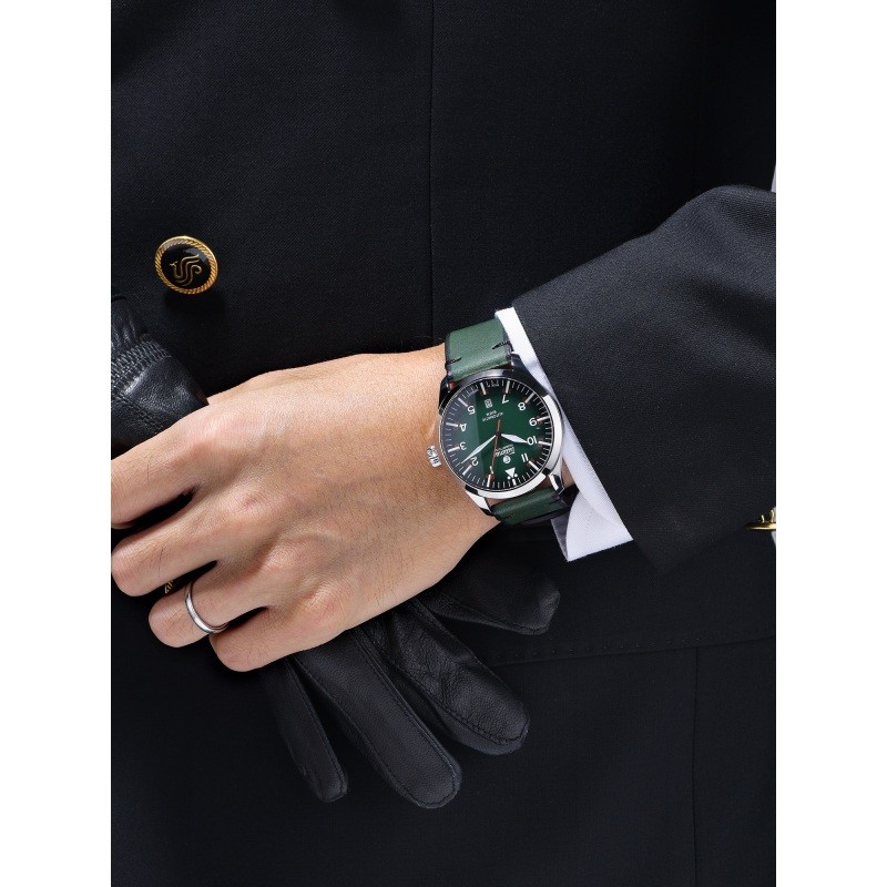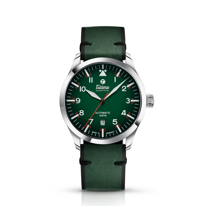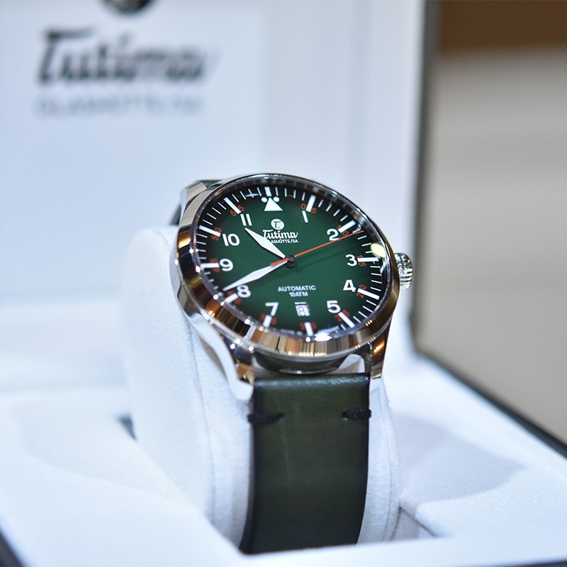 Tutima 拓天马 Flieger飞行员系列 男士自动机械表 6105-29,此款“绿色”在腕表配色设计中十分流行,可以说是达到了“逢绿必火”的现状。绿的“骚”气、绿的亮眼,符合大多数表友购买机械腕表的初衷,渐变绿色盘面,象征着蓬勃的生命力,盛装绽放。阿拉伯文时分双层显示,红银标识,实用至上。齿状旋入式表冠,提供更好的防水性能。V8级ETA2836机芯改良,透底设计,时刻感受时光运转之美,18K金T字品牌印记,彰显高端制表品牌实力。