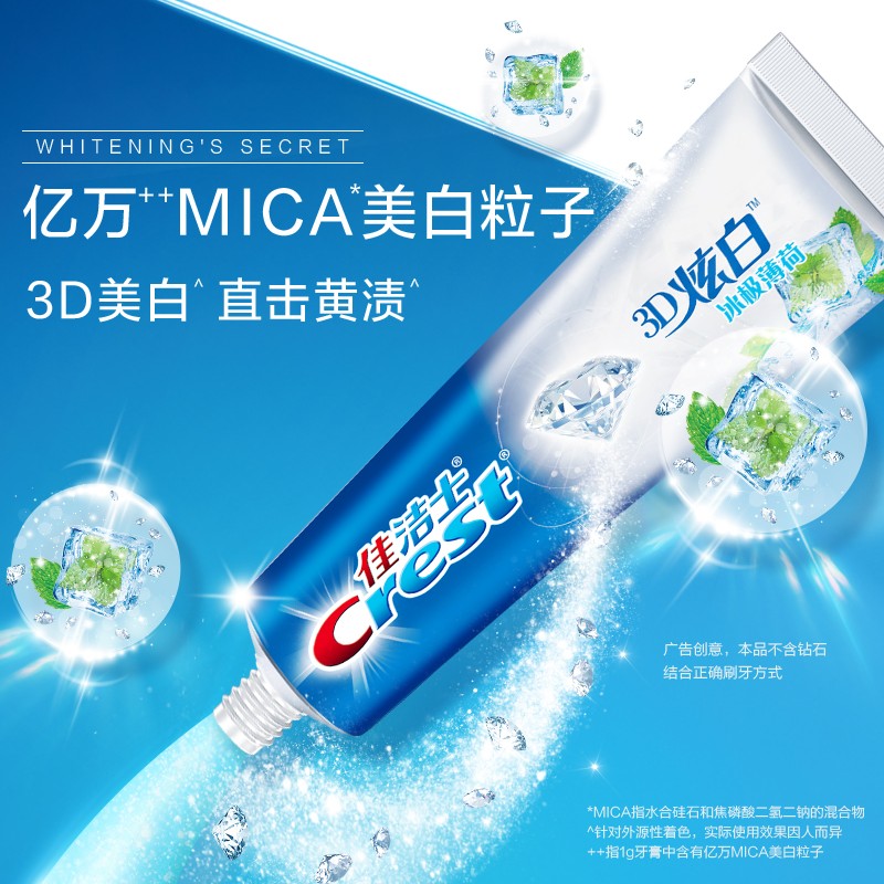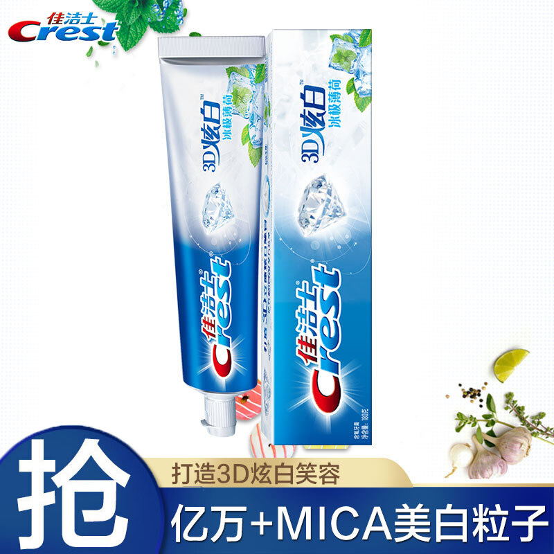 Crest(佳洁士)是美国宝洁公司的口腔护理品牌,诞生于1955年。 其产品包括全优7效,牙龈护理,抗过敏护理,防蛀修护牙膏以及牙刷等。这款佳洁士3D炫白冰极薄荷牙膏,规格180g,升级MICA炫白+冰极薄荷,泡沫细腻,可有效清洁牙齿。