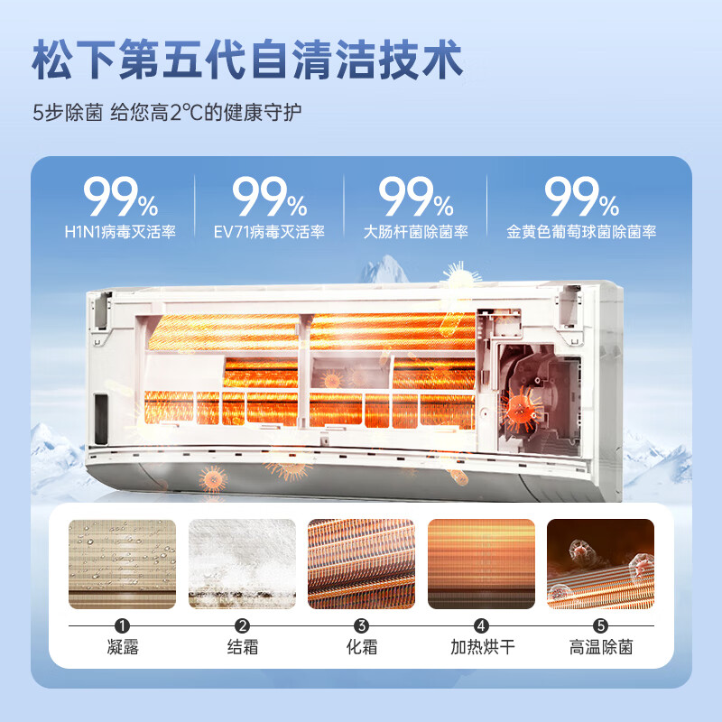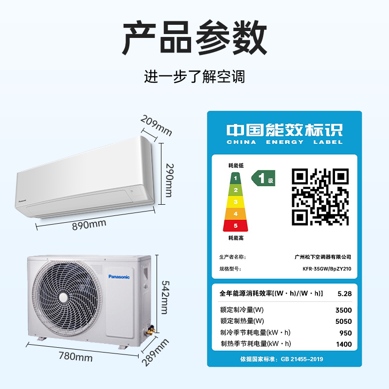 Panasonic 松下 滢风系列 ZY35K210 1.5匹 壁挂式空调,APF值高达5.28,高于新一级能效标准,节能省电。第五代自清洁技术,核心部件抗菌防霉,打造全方位清洁的空调内部环境。制冷自动切换天花板气流,制热自动切换地板气流,快速达到舒适温度,电辅热增强制热能力。左右自动送风,立体循环吹风,一键睡眠模式自动调整温度和风速,可通过松下APP和微信小程序控制操作。