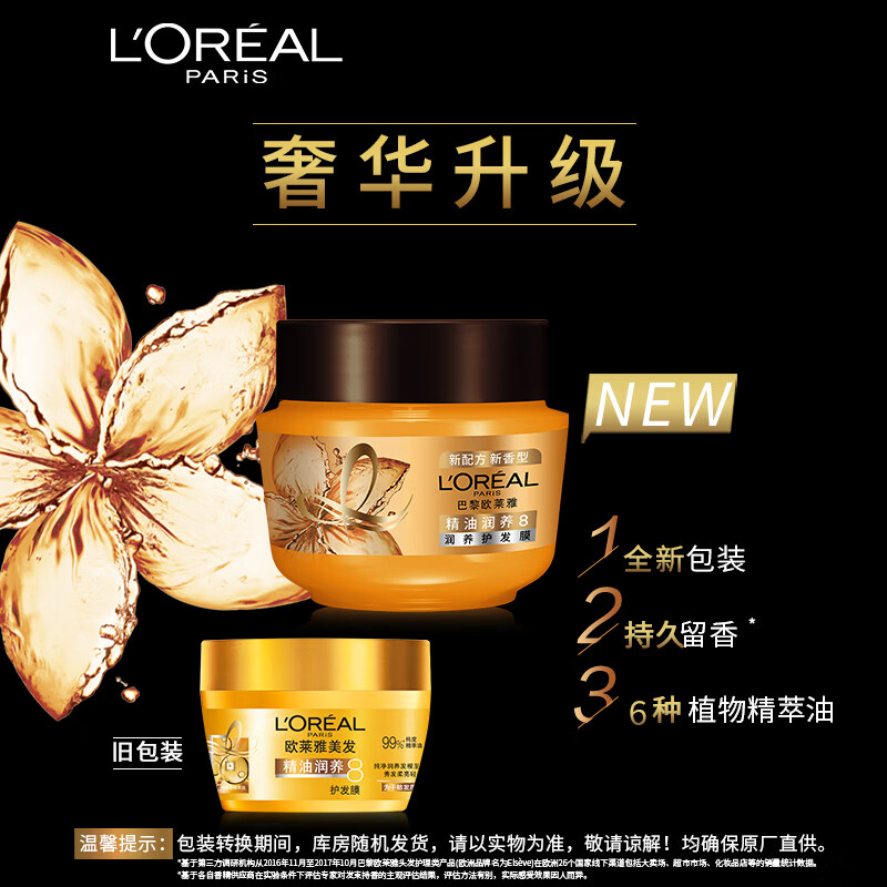 L'OREAL PARIS巴黎欧莱雅精油润养护发膜,富含摩洛哥坚果精油与亚麻荠油,从根部开始,养出秀发繁叶般的新生命。浓稠不油腻乳霜质地,富含精纯珍贵摩洛哥和亚麻荠油,深透三重润养发根、发丝、发梢,令发丝绒柔、莹润、滋养,感受秀发的神奇蜕变。