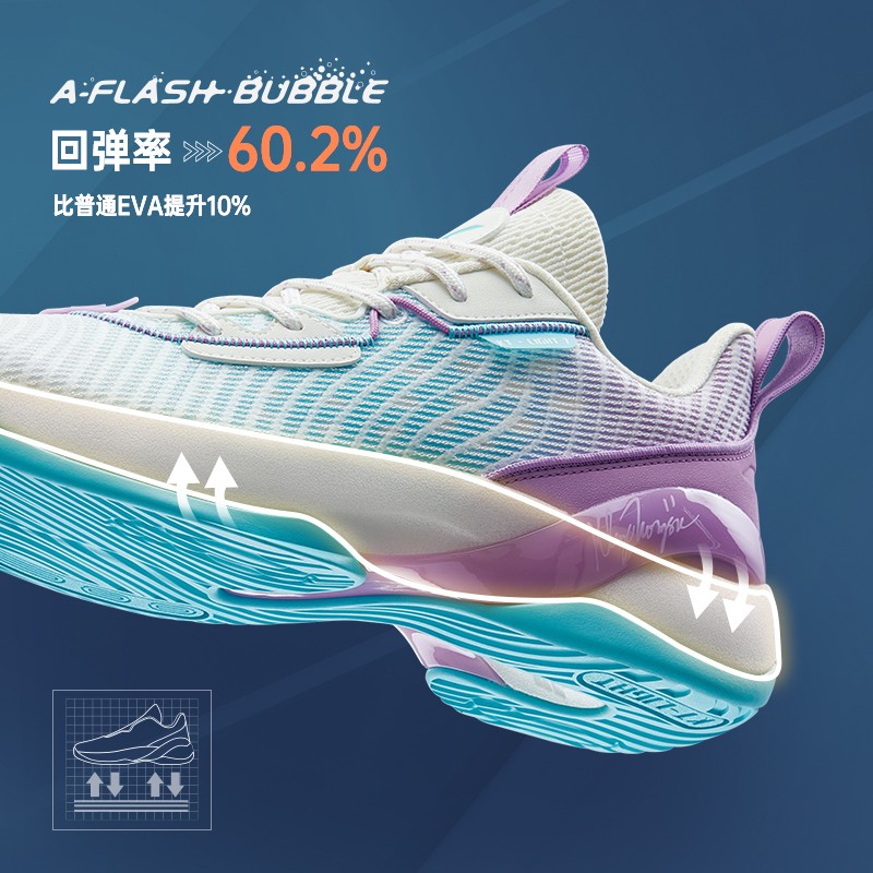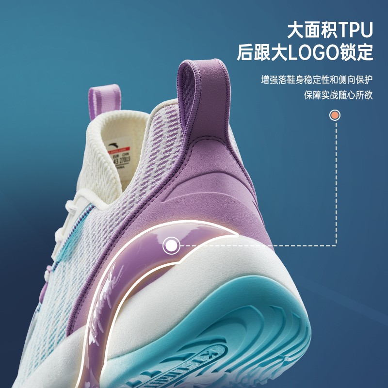 高强度TPU编织材料,拥有轻质柔韧的帮面透气同时,进一步提升鞋面包裹性和舒适度,兼具"专业实战性能"与"清凉透气" 。大面积TPU,后跟大LOGO锁定,增强落地的鞋身稳定性和侧向保护,保障实战随心所欲。