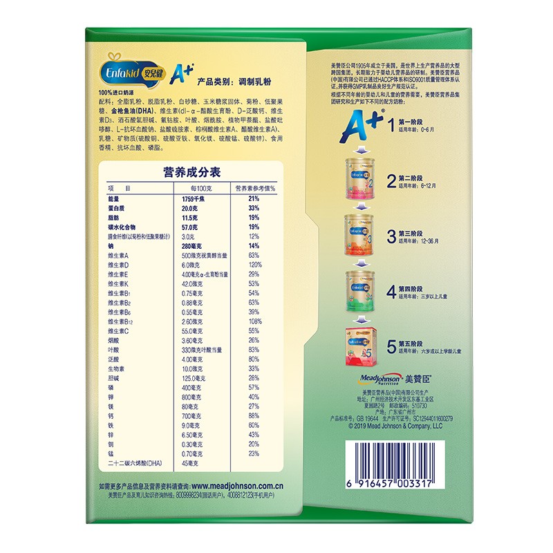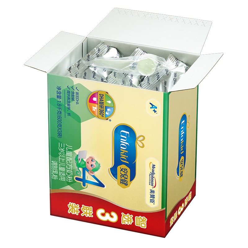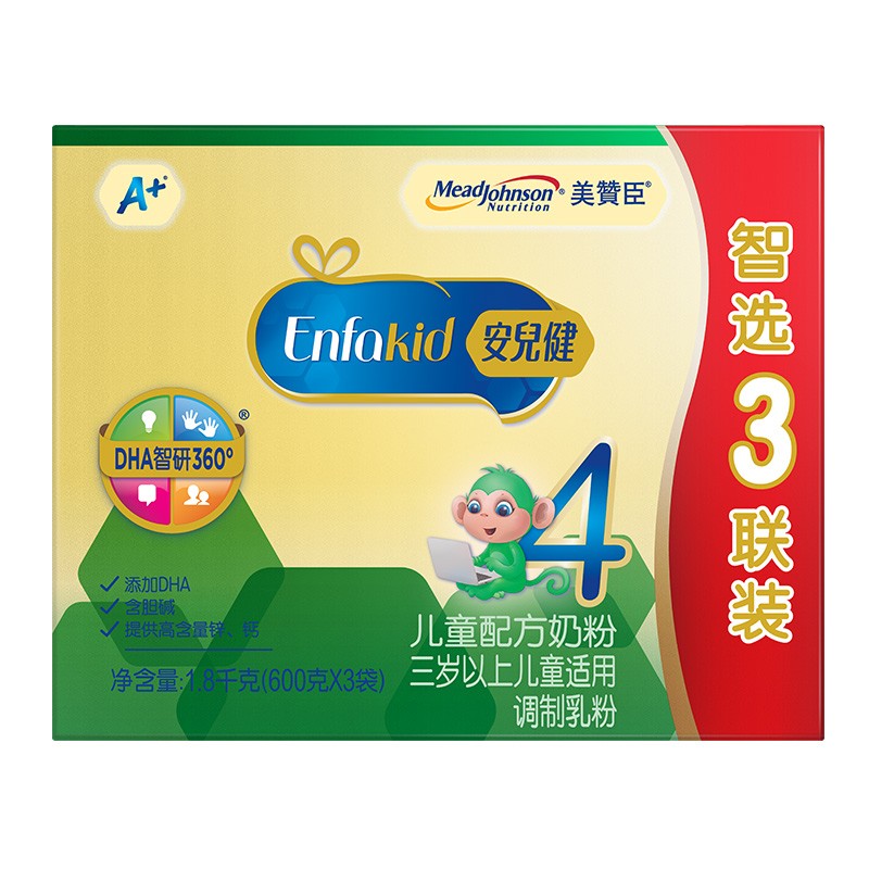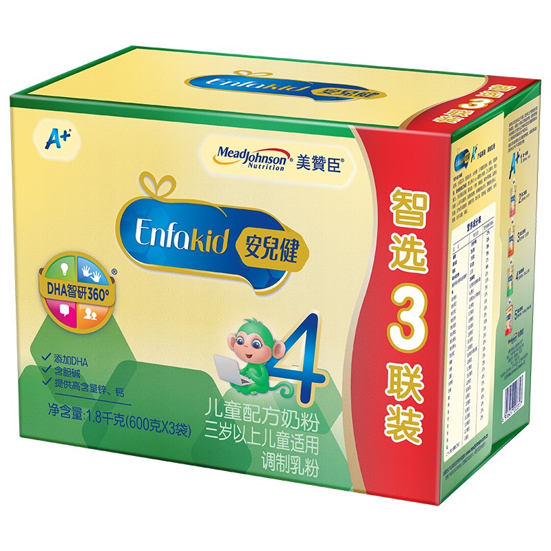 MeadJohnson Nutrition 美赞臣安儿健A+4段配方奶粉,作为一种补充均衡营养的配方食品,适合3岁以上儿童服用。采用全新脑部营养先进配方,含高水平的DHA,特别添加益生元,给宝宝带来A+智力和A+记忆力。全新的益生元组合,给宝宝带来A+保护力。丰富的蛋白质和钙、铁等矿物质及多种维生素,适合3岁或以上儿童。规格:1200g。