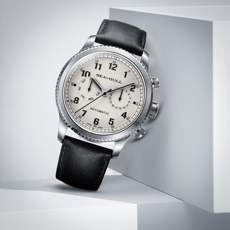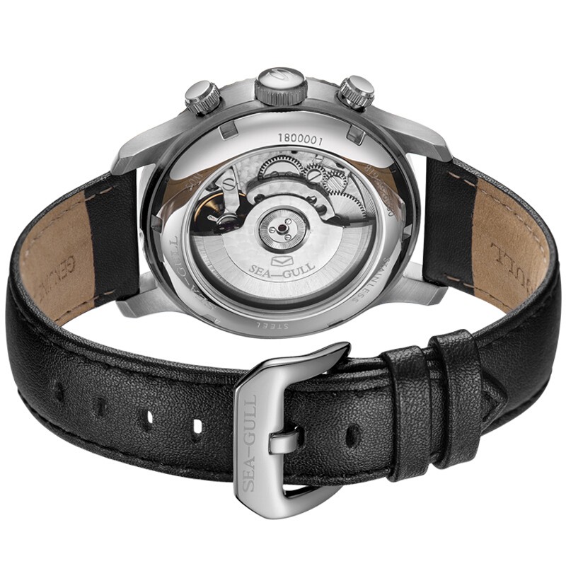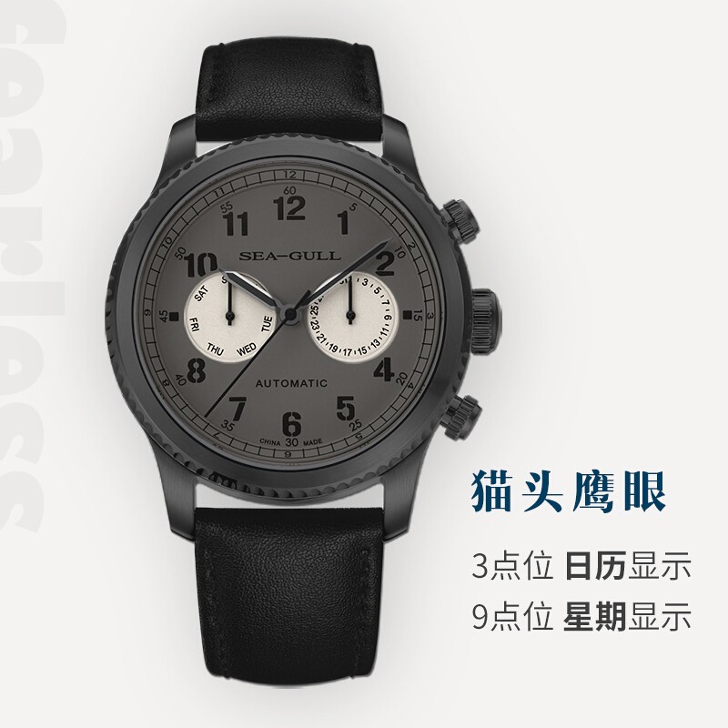 SEA-GULL 海鸥 飞行员系列 男士机械手表 819.93.6080,此款腕表采用经典大三针设计在0°、180°参考望远镜水平瞄点并加载日历、周历功能(3点位日历9点位周历)。上按钮勇于调校内圈第二时区突破传统技术,内敛实用。用她记录你与世界的时间,从此国界不再是距离,316L精钢外圈通过人工打磨成圆,滑锯齿状,为飞行员外壳增加物理防护性能。高强度镜片,硬度仅次于钻石,无惧刮擦;高透清晰效果,呈现表盘内璀璨风景,50米生活防水,自动上链,表壳直径43mm,表壳材质精钢,字钉阿拉伯数字,表底透底。