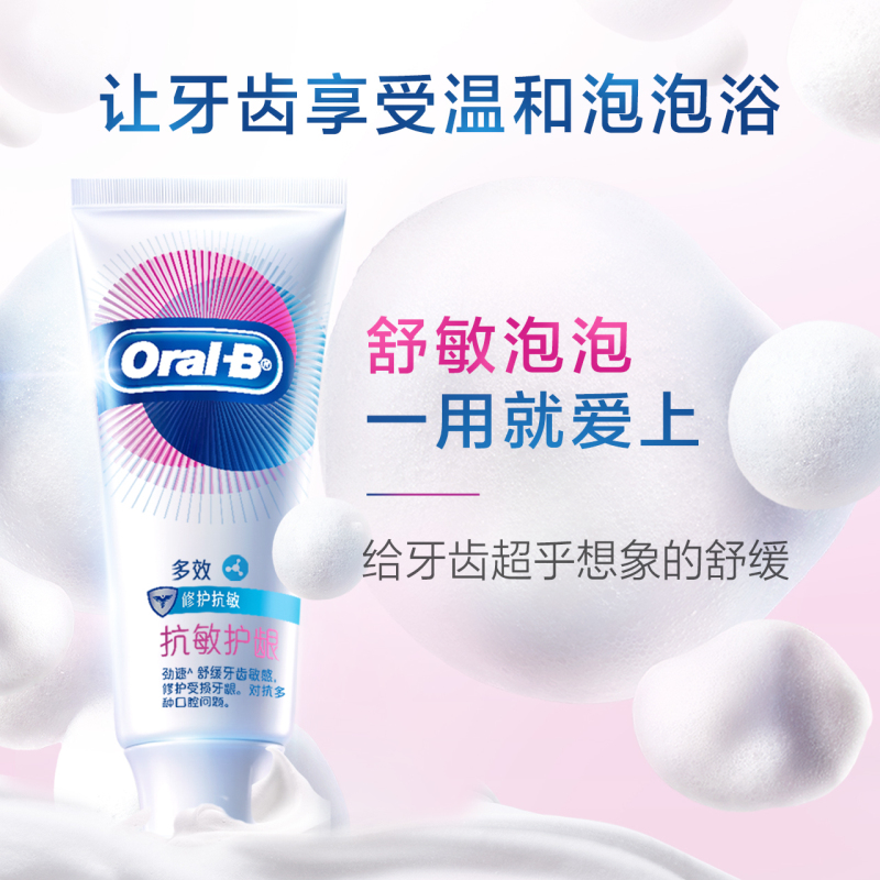 Oral-B欧乐-B泡泡牙膏中的这款抗敏护龈系列,是一款多效修护抗敏的牙膏,针对牙齿敏感,快速舒缓突发的刺痛,特含专业的口腔护理成分亚锡,扎实封堵暴露的牙本质小管,从而改善牙齿敏感。同时延续该系列对牙龈的呵护,丰富的泡泡让刷感更舒适,刷完口腔更有清爽的感觉。