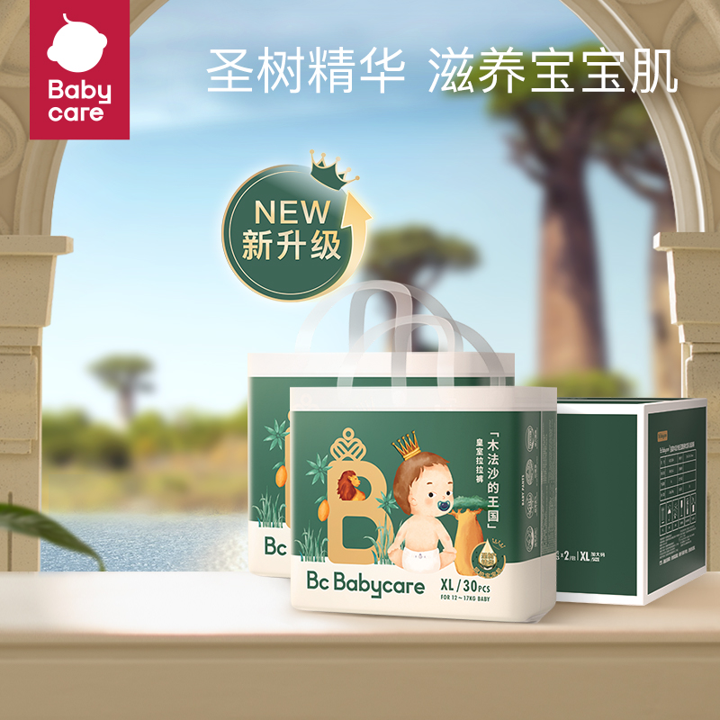 Babycare是杭州贝咖实业有限公司旗下的品牌,目前国内最具朝气和市场竞争的母婴品牌之一,Babycare始终以关注婴幼儿身心特点为核心理念,全力打造让婴幼儿舒适、让妈妈放心的产品,旗下有艺术大师、皇室、飞享、Air超薄等系列婴儿纸尿裤。这款皇室系列拉拉裤选用高分子魔力芯体,能吸收自身重量50倍的液体,吸水量高达800ml,相当于宝宝8次尿量,表层添加弱酸性成分,亲肤不刺激,表面含有50000个呼吸微孔,排走闷热湿气,屁屁自由呼吸,弹力腰围不勒小肚肚,贴合小屁屁不侧漏,宝宝随意翻滚不漏尿,小内裤设计轻柔贴身,穿脱方便,更加节省时间。